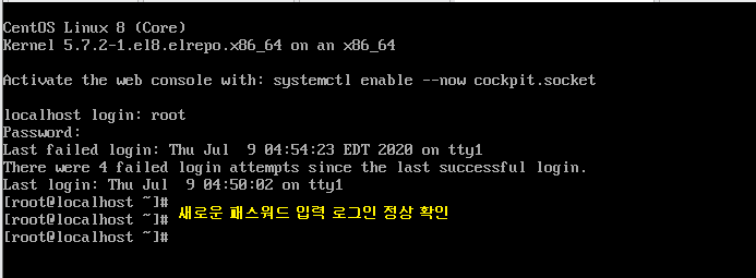 이후 자동으로 부팅이 되며 로그인 화면이 나오므로 새로운 패스워드 입력 후 정상 로그인 확인하면 됩니다.