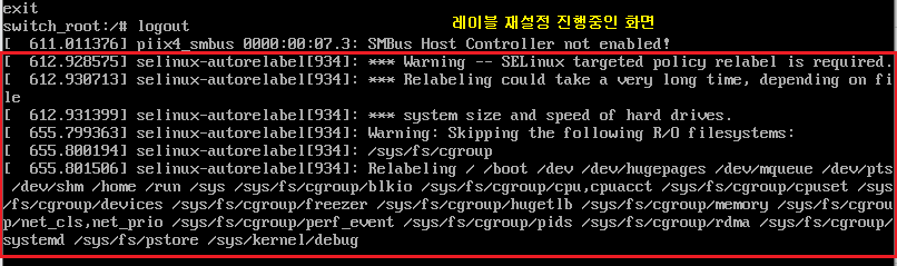 ※ SELinux 기능이 [ enforcing ] 적용되어 있고 [ autorelabel ] 실행 후에 재시작하면 다음과 같이 레이블을 재 설정하기 때문에 부팅이 오래 걸릴 수 있습니다. 인내심 있게 기다리시면 자동으로 부팅됩니다.