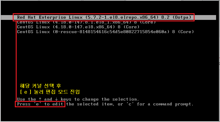 서버 재부팅 시 GRUB 메뉴에서 편집 모드로 접근합니다. 일반적으로 시스템 부팅되는 커널을 선택 후 [ e ] 누릅니다.