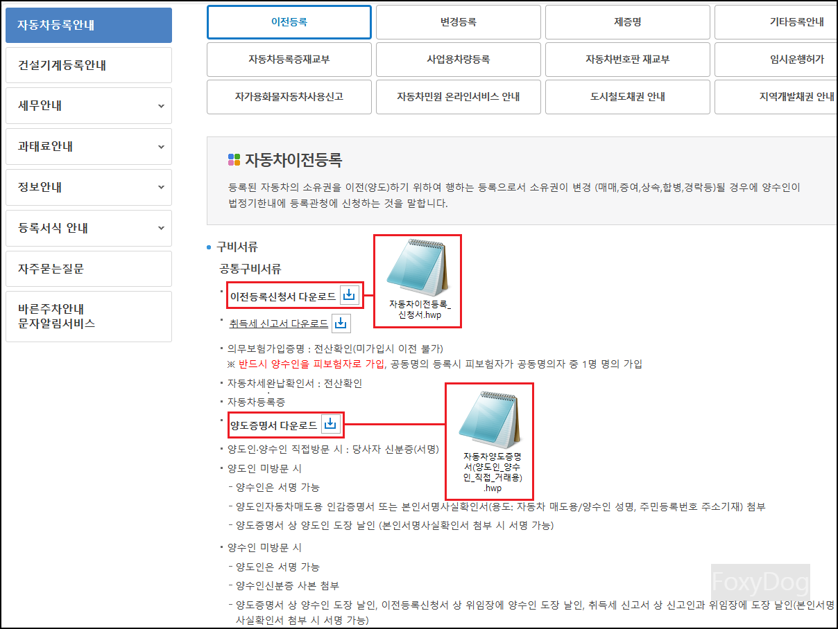 ④ 서류 작성 「이전등록신청서」와 「자동차양도증명서」