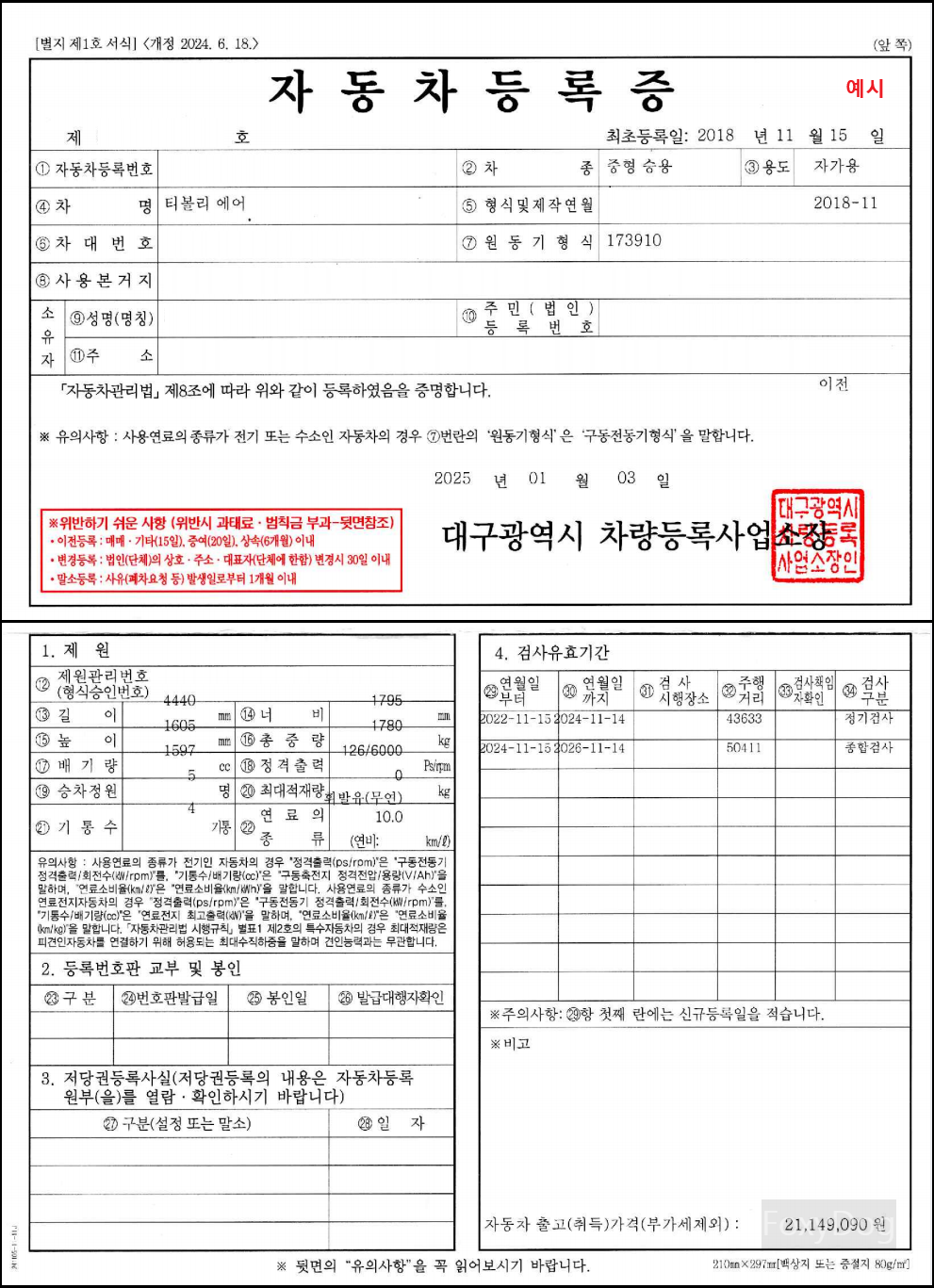 이제 납부서 겸 영수증을 받고 조금만 기다리면 당일 바로 「자동차등록증」이 발급됩니다. 이제 정식으로 차량이 필자의 명의로 이전이 되었습니다. 아래는 등록증 예시 입니다.