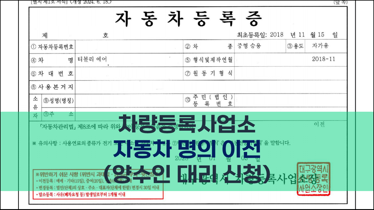필자의 경우, 「양도인」이 방문하지 못해 「양수인」인 제가 차량등록사업소에 직접 방문하여 명의 변경 신청을 진행했습니다. 이전 등록은 주소지와 관계없이 가까운 차량등록사업소에서 처리할 수 있으니, 편리한 곳을 선택하면 됩니다. 아버지의 재활 병문안을 겸해 대구 수성구에 위치한 차량등록사업소를 방문하여 명의 변경 절차를 완료했습니다.