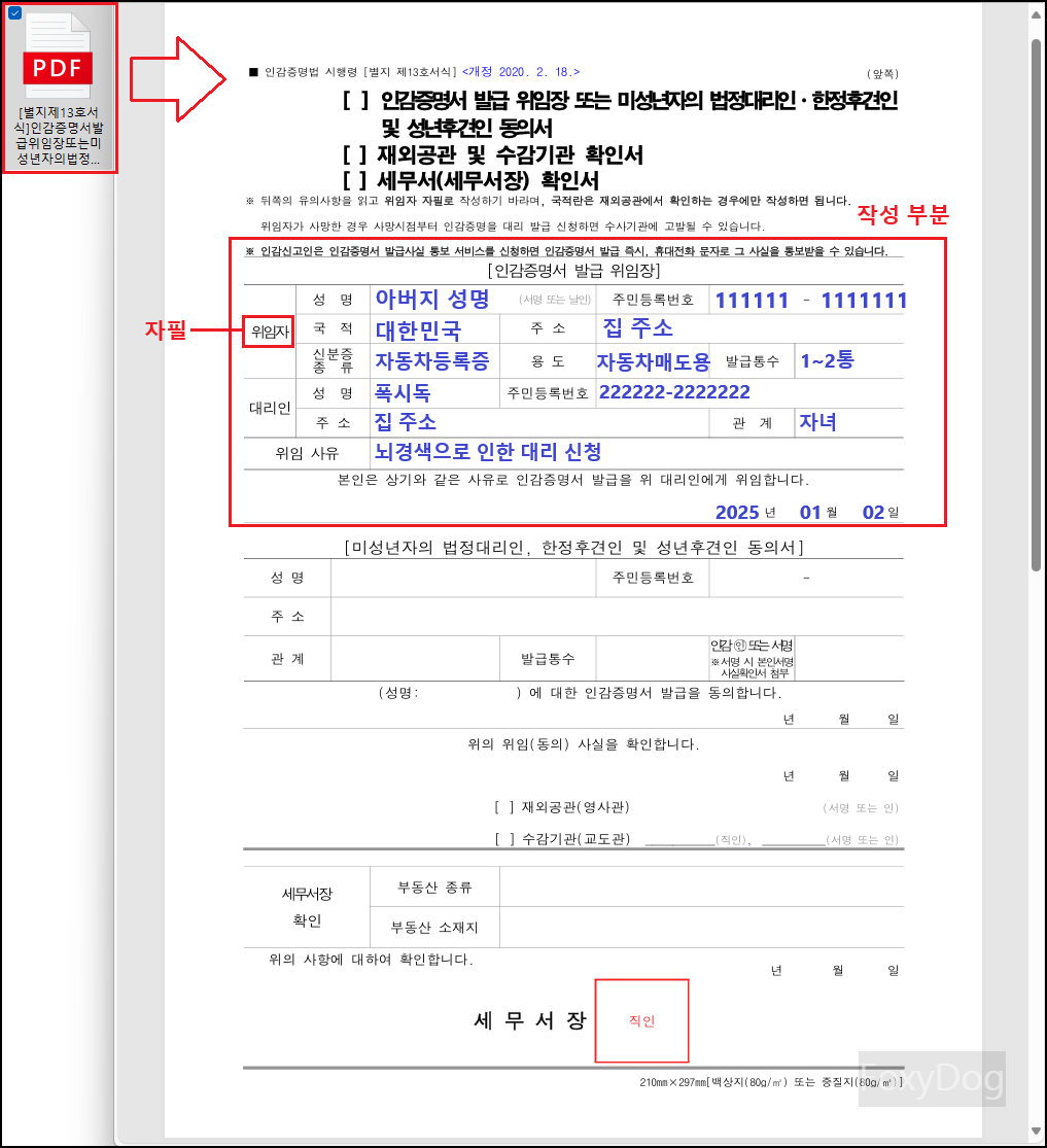 필자의 경우는 양도인(아버지)께서 전혀 움직이지 못하는 상황이라 인감증명서도 대리로 발급을 해야 하는 상황이었습니다. 먼저 정부 24 공식 홈페이지에 「인감증명서 발급 위임장(링크)」 방문하여 서식을 다운로드합니다. 아래는 대략 예시로 작성하였습니다.