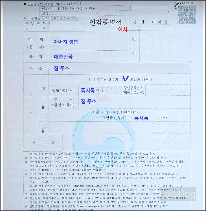 ※ 「차대번호」는 보통 자동차등록증이나 자동차보험 가입증명서에서 확인하면 됩니다. 「매매금액」은 친척/가족 간의 거래라면 최소 「일만 원」 이상으로 대충 적어도 됩니다. 타인과의 거래라면 실제 거래 금액을 적으시면 됩니다. 서명(인) 부분은 아버지와 필자의 개인 인감도장으로 전부 찍었습니다.