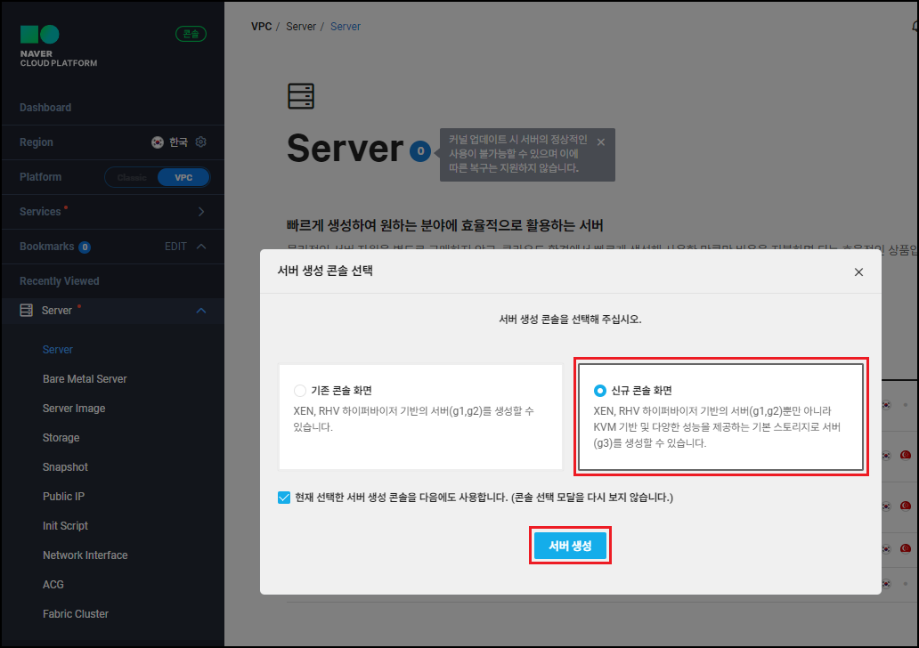 네이버 클라우드 콘솔에서 → 「 Services → ALL → Compute ( Server ) 」를 선택합니다. 서버를 생성할 때는 Classic이 아닌 기본 VPC「Virtual Private Cloud」 방식을 사용해야 하며, 이로 인해 사설 네트워크 설정 과정을 거쳐야 합니다.