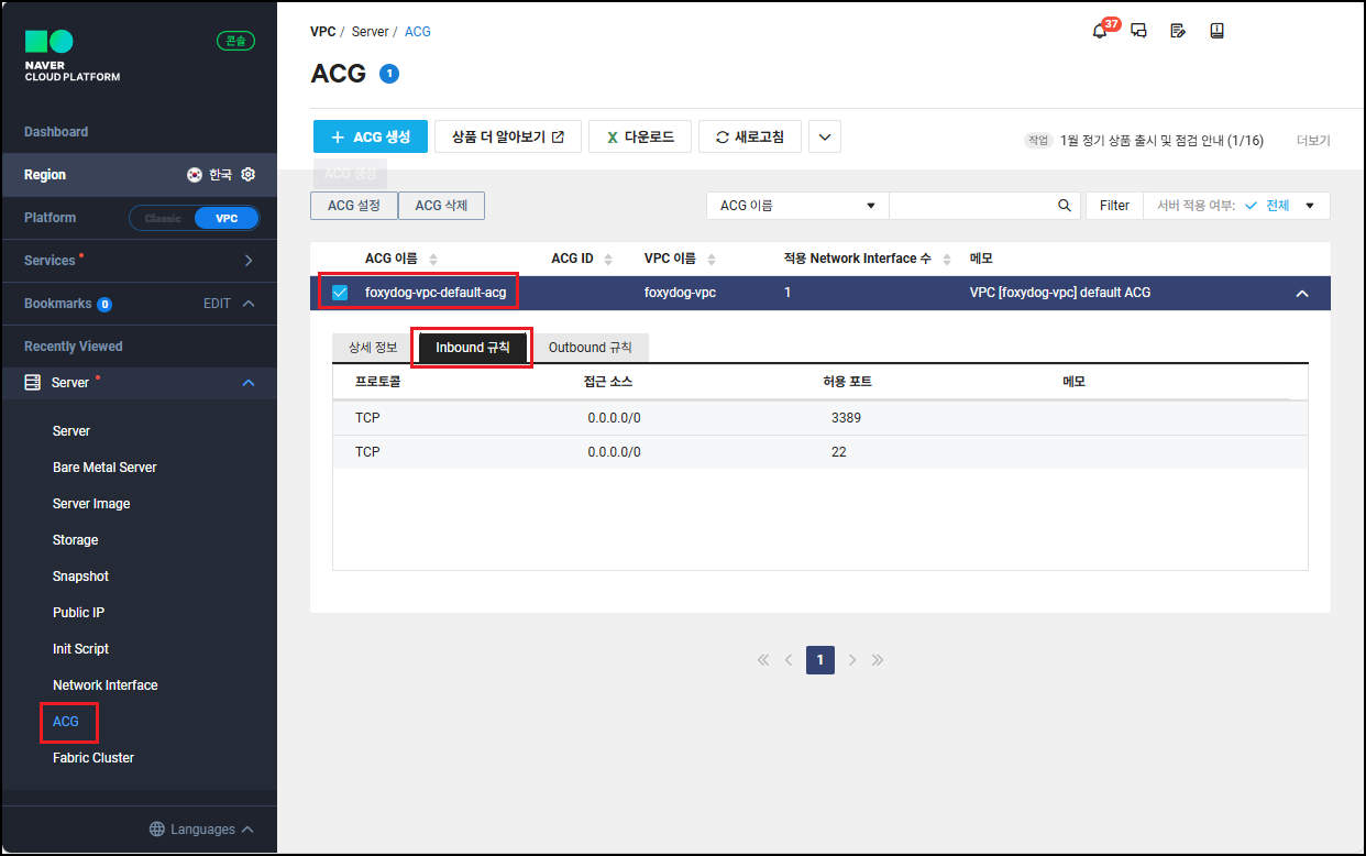 ACG는 클라우드 서비스에서 제공되는 IP/포트 기반 필터링 방화벽입니다. 이를 통해 각 서버마다 별도의 호스트용 방화벽을 설정하지 않아도, 서버 간 네트워크 접근 제어나 서버 그룹에 대한 규칙을 쉽게 구성하고 관리할 수 있습니다.