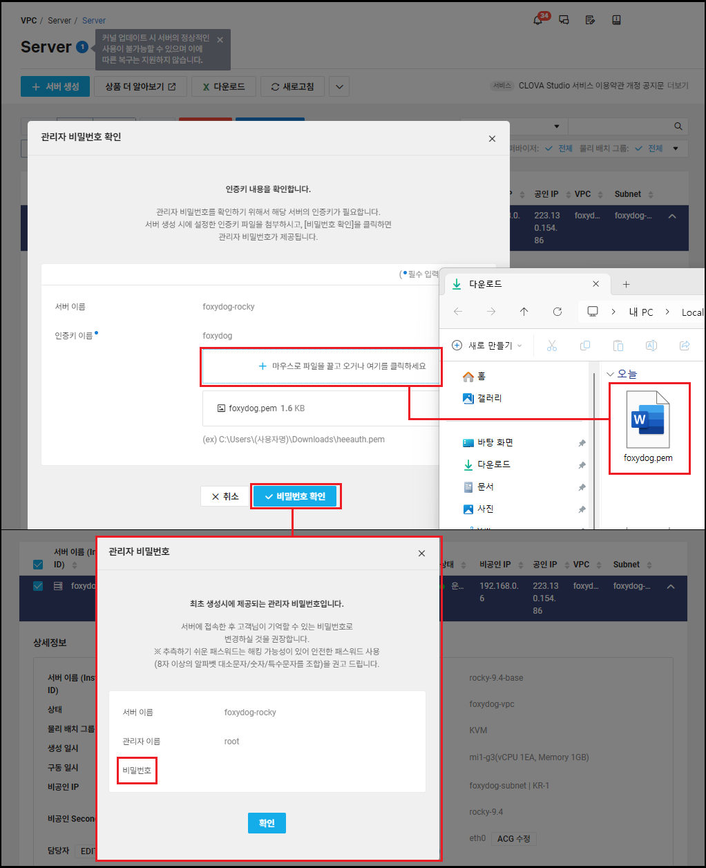 서버 SSH 루트 접근을 위해 관리자 비밀번호 확인이 필요합니다. 이 과정에서는 서버 생성 시 인증키로 생성된 .PEM 파일을 사용하여 비밀번호를 확인해야 합니다. 서버에 접속한 후에는 본인이 기억하기 쉬운 비밀번호로 변경하는 것을 권장합니다.