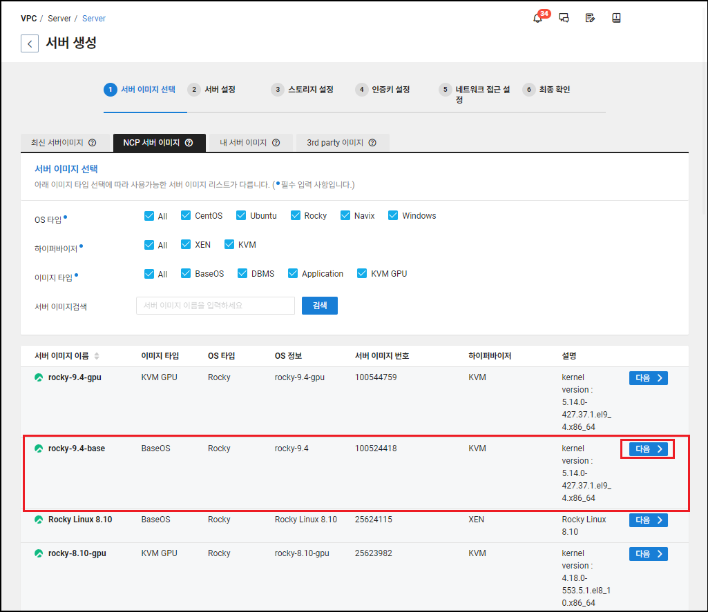원하는 리눅스 배포판을 선택하여 설치하면 됩니다. 이번 포스팅에서는 「Rocky Linux 9.4-Base」를 설치해 보겠습니다. 「-gpu」 옵션은 GPU가 장착된 서버로, 그래픽 작업, AI 모델 학습, 빅데이터 분석 등의 작업에 적합한 플랫폼입니다. 일반적인 서버와 목적이 다르므로 선택 시 용도에 맞게 고려해야 합니다. 애초에 초소형 서버의 낮은 스펙으로는 설치하더라도 이용하기 어렵습니다.