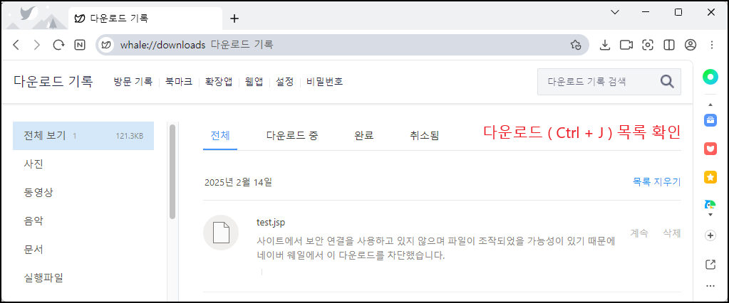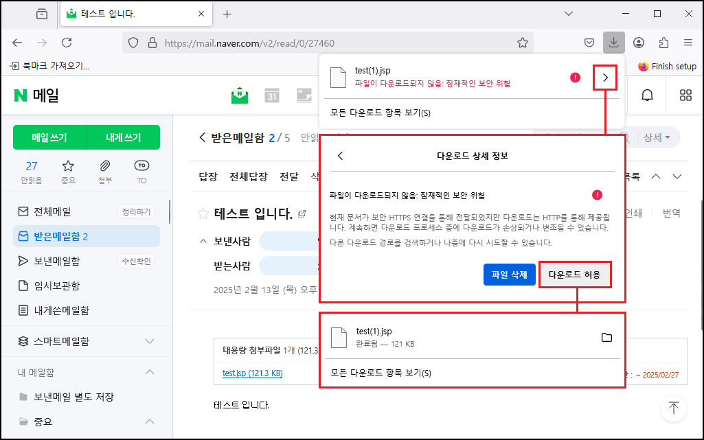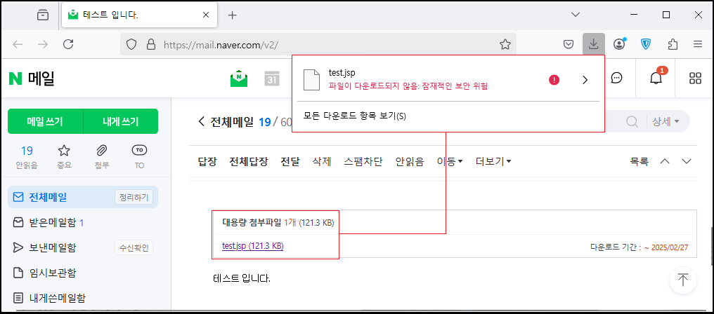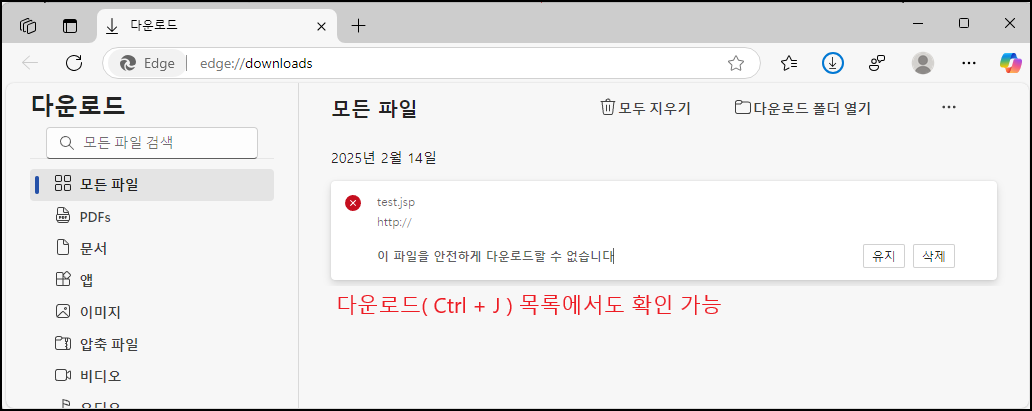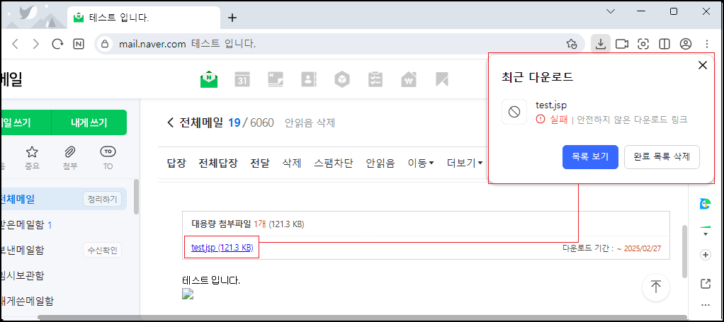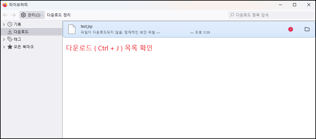 예전에는 경고 팝업창으로 「안전하지 않은 다운로드가 차단됨」이라는 메시지가 표시되었지만, 이제는 아예 아무런 반응 없이 완전히 차단되는 방식으로 보안 조치가 강화된 것으로 보입니다. 이렇게 처리되면 다운로드 기록(Ctrl +J)에도 남지 않아, 수신자는 자신이 이용하는 웹사이트나 메일 서비스에 문제가 있다고 오해하기 쉬운 상황이 발생합니다. (우리 문제가 아닌데, 억울해서 남김...)