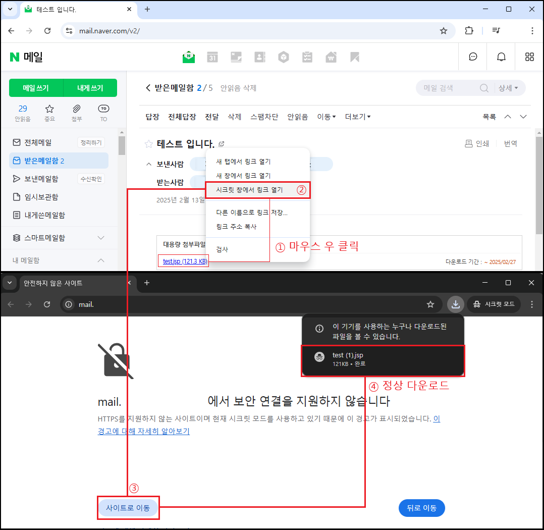※ 다운로드를 하고 싶다면,「첨부파일 링크 마우스 우 클릭」 → 「시크릿 창에서 링크 열기」 → 경고문「사이트로 이동」 진행하면 됩니다. 내용에 이유가 나와 있습니다. URL 링크 주소가 HTTPS를 지원하지 않는 사이트이기 때문입니다. 새 창에서 링크 열기도 같은 브라우저 세션이라 시도 자체가 안되게 막혀 있습니다. 그래서 시크릿 창에서 시도를 하는 부분입니다. 또는
