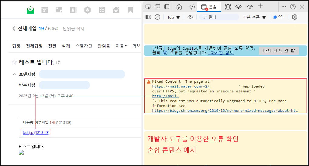 간단히 말해, HTTPS(SSL 보안이 적용된) 웹(메일) 사이트에서 HTTP(비보안) 콘텐츠를 불러오는 경우를 뜻합니다. 예를 들어, HTTPS://도메인 주소에서 HTTP://도메인 주소를 통해 첨부파일, 이미지, 오디오, 비디오, 스트리밍 등을 불러오는 모든 경우가 이에 해당됩니다. 이러한 혼합 콘텐츠는 보안 문제를 초래할 수 있어 브라우저가 이를 차단하도록 설계된 것입니다.