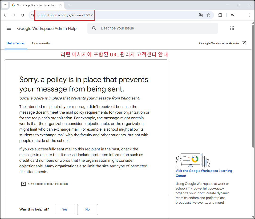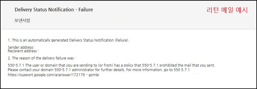 ▣ 메시지만 봐도 수신 측이 구글의 「G Suite」 메일 서비스를 사용하고 있다는 것을 알 수 있습니다. URL 접근해 보니 「(신) Google Workspace」라고 표시가 되어 있던데 알고 보니 「(구) G suite」는 예전 명칭이고 지금과 같은 비즈니스 서비스 이름으로 통합을 한 것 같습니다. 하여튼 그게 중요한 게 아닌, 이것도 이미 리턴메시지에 답이 나와 있습니다. 귀하가 보낸 메일을 금지하는 정책이 있다고 메일 받는 것을 거부했네요. 정확히 메일의 어떤 부분 때문인지는 알 수 없으므로 도메인 관리자에게 문의하라는 문구가 있습니다.