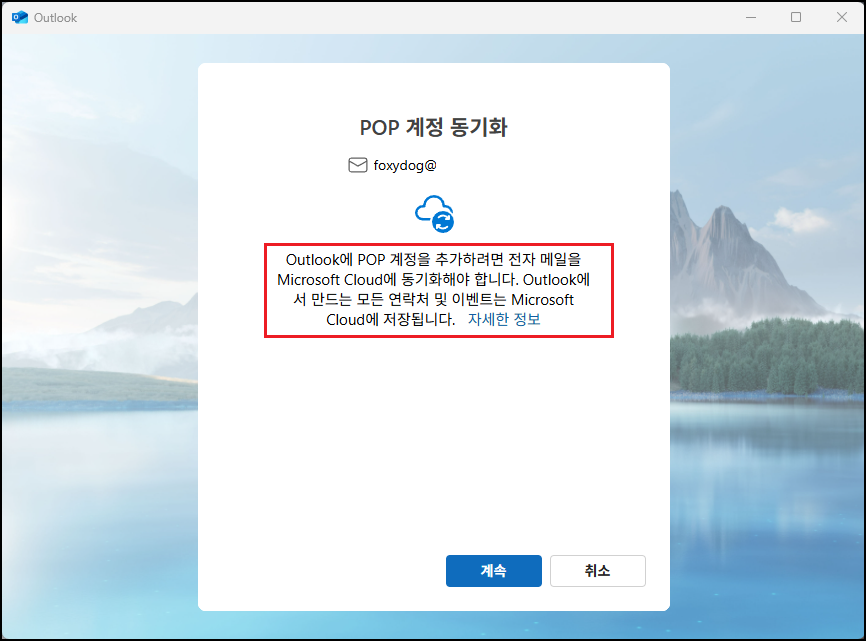 「Outlook에 POP 계정을 추가하려면 먼저 메일을 Microsoft Cloud에 동기화해야 합니다. Outlook에서 만드는 모든 연락처 및 이벤트는 Microsoft Cloud에 저장됩니다.」