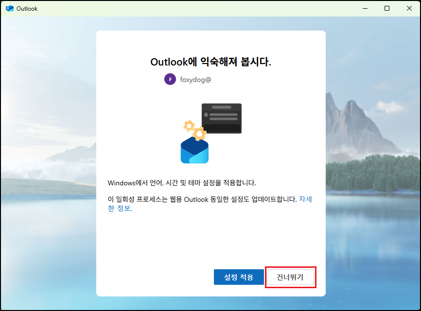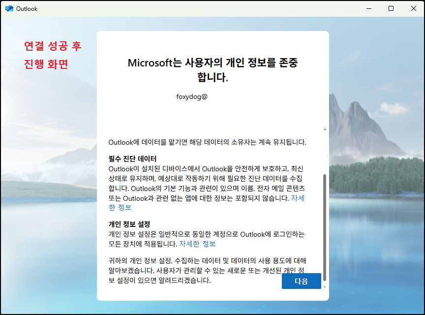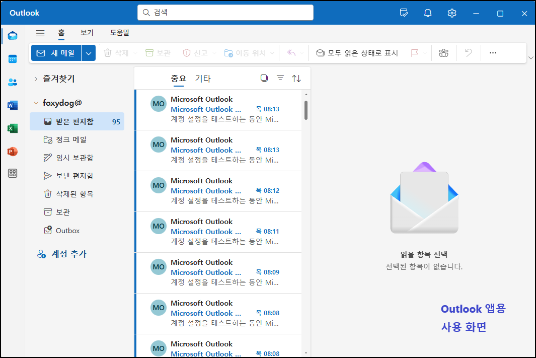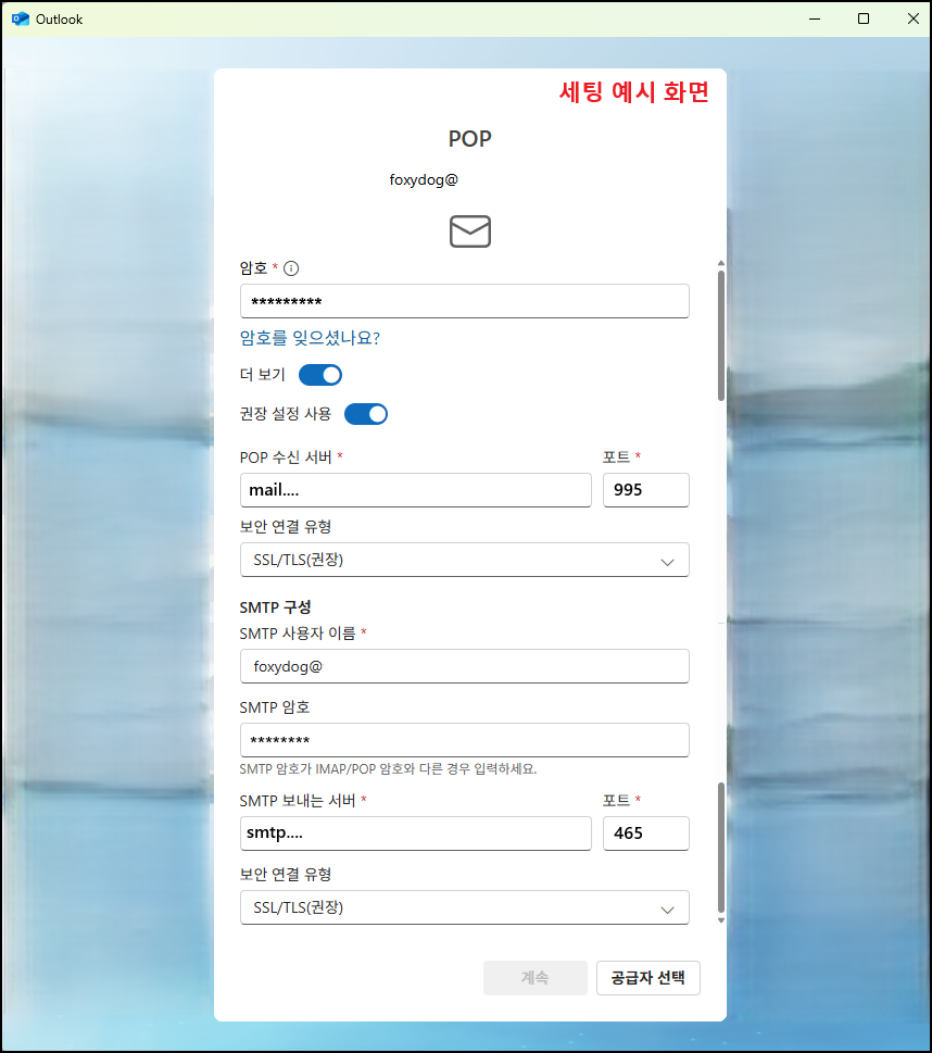 이번에는 무료 앱용 Outlook을 이용하여 세팅을 해보도록 하겠습니다. 세팅 정보는 Outlook (Classic)과 전부 동일하며, 다음과 같이 세팅을 진행하였습니다.
