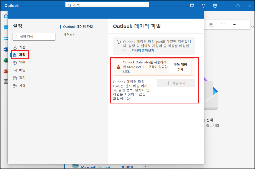 | Outlook 데이터 파일(PST) | 사용 불가 (구독 계정 있어야만 사용 가능) |