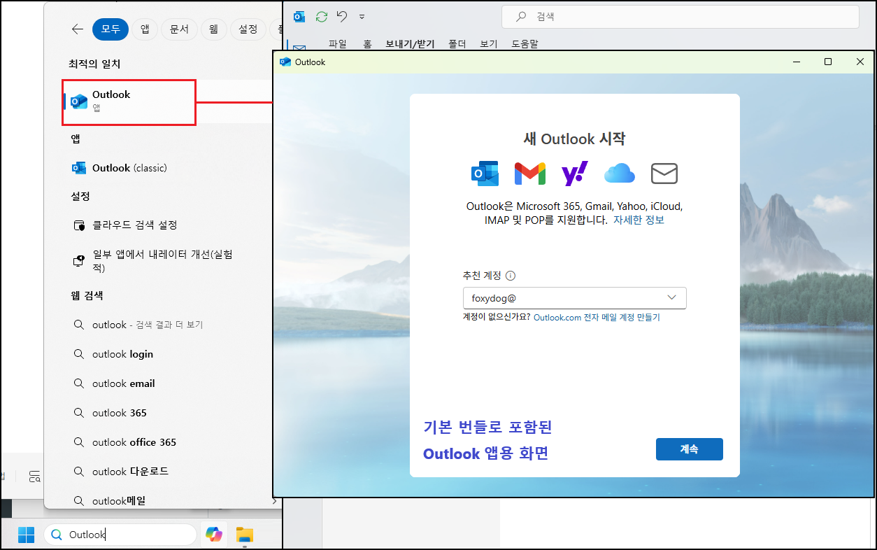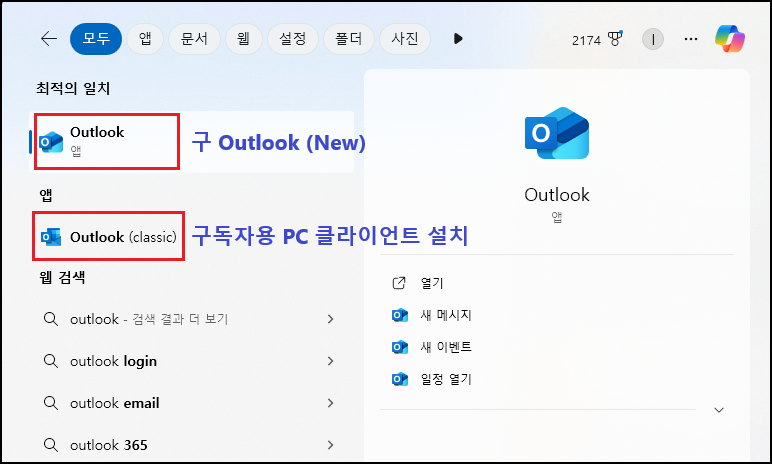 그런데, 요즘 Windows 11에서 설치된 Outlook을 검색해 보면 두 개의 서로 다른 앱이 나와서 어떤 프로그램을 사용해야 하는지 혼동이 많이 발생하는 것으로 보입니다. 미리 간단하게 정리해 드리자면,