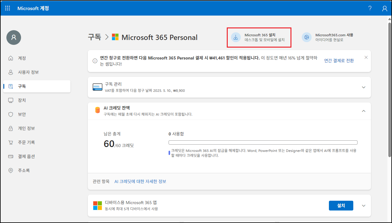 필자는 개인용(Personal)으로 매월 구독하여 정품으로 사용 중입니다. 내 계정 「구독」 메뉴를 통해 하나의 계정으로 동시에 최대 5대의 PC 클라이언트(디바이스) 설치가 가능합니다. 그리고 설치가 완료되면 Microsoft 365 구독 서비스 중 하나인 아웃룩(Outlook) 프로그램을 이용할 수 있습니다.