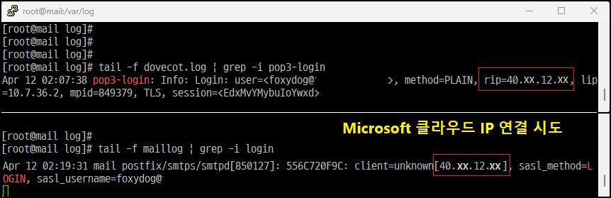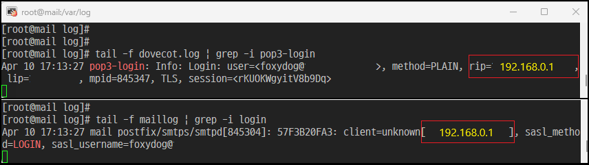 또한 웹메일 서버 정보에 연결 시 「받는 메일 서버(POP3)」와 「보내는 메일 서버(SMTP)」로 다이렉트 연결 시도하므로 복잡한 네트워크 환경에 영향을 덜 받습니다. 아래는 실제 개인 메일서버에서 Dovecot(POP3), Postfix(SMTP) 연결 시 PC 클라이언트 IP를 바로 확인할 수 있었습니다. 이처럼 별도의 인바운드 방화벽에서 걸리는 게 없다면 아웃룩 연결에도 큰 문제가 없습니다.