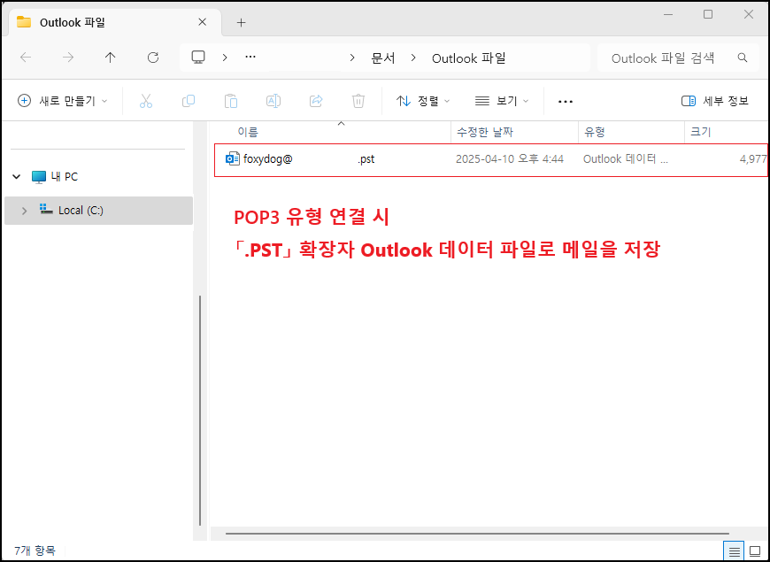 Outlook (Classic)을 이용하여 POP3/IMAP 프로토콜을 연결하면 웹메일에서 가져온 메일을 개인 PC에 저장하게 됩니다. 계정이 연결된 데이터 파일 위치를 열어보면 「. PST」 확장자 Outlook 데이터 파일로 모든 정보를 저장(POP3 한정)하며, 해당 파일을 잘 보관(백업)하면 다른 PC 클라이언트 또는 재 설치 시 언제든 복구가 가능합니다.