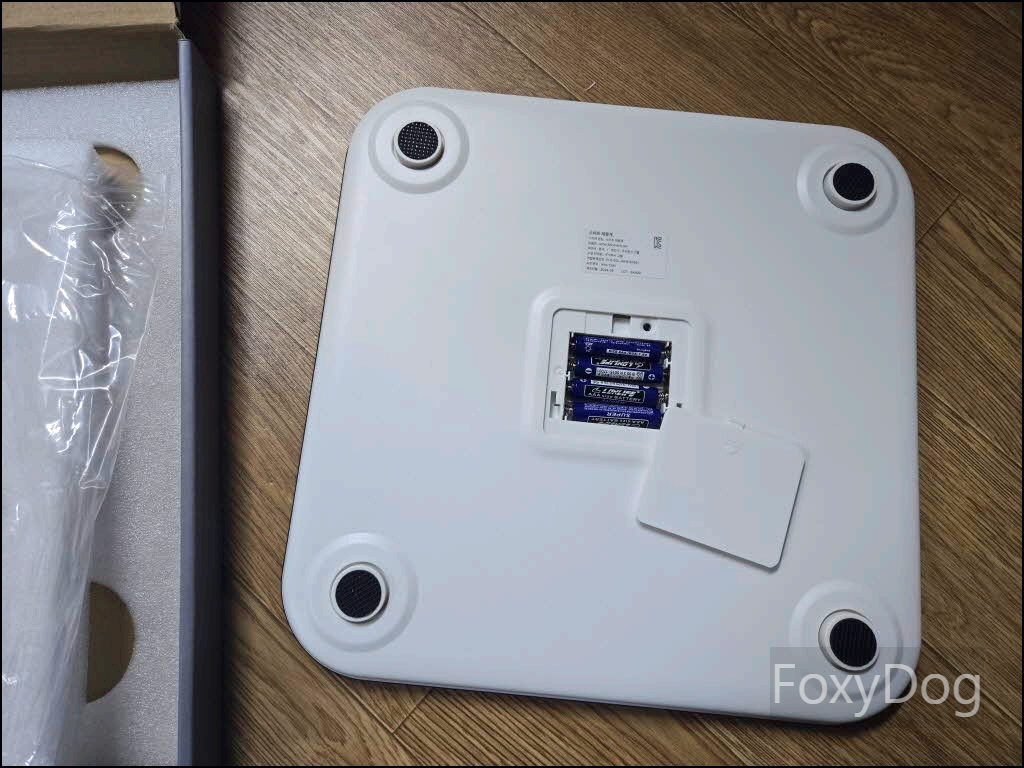 전원은 AAA 건전지 4개를 사용하며, 기본 번들로 포함되어 있습니다. 전원이 들어온 상태에서 체중계에 올라서면 Wi-Fi 연결을 위한 깜빡임이 시작되며, 동일하게 헤이홈 앱에서 연동이 가능합니다.