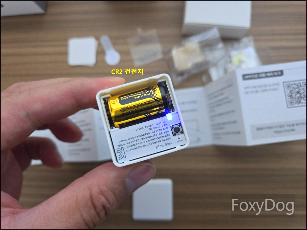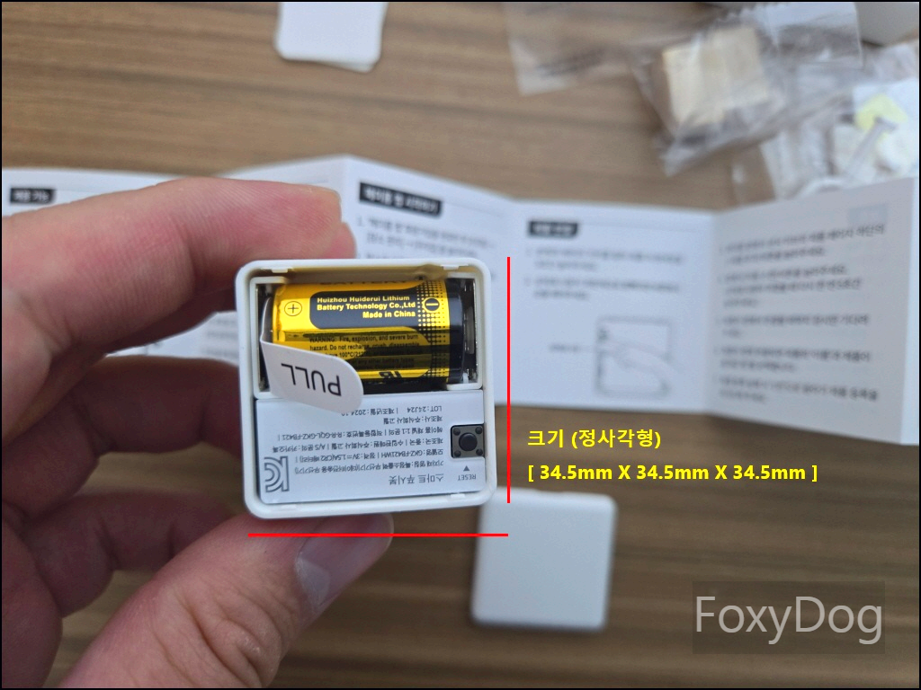 생각했던 것보다는 크기가 작습니다. 크기는 「34.5mm x 34.5mm x 34.5mm」로, 정사각형 형태를 하고 있습니다. 배터리 커버를 열어보면 CR2 건전지가 들어 있는 것을 확인할 수 있습니다. "PULL"이라고 적힌 종이를 당기면 건전지에서 전원이 공급되면서 파란불이 들어오고, 이후 작은 RESET 버튼을 5초 동안 꾹 눌러주면 연동 모드로 전환되어 스마트 허브와 연결할 수 있습니다. 커넥트 부분은 다양한 환경에 대응할 수 있도록 모듈 교체형 구조로 되어 있어 활용성이 높습니다.
