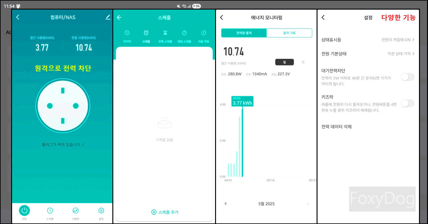 이제 네트워크 연결에 문제가 없다면 외부에서도 원격으로 전력을 차단할 수 있습니다. 세부 설정을 확인해 보면 생활 패턴에 맞게 스케줄링을 만들 수도 있으며 실시간 사용량 또는 전체 에너지 모니터링을 할 수 있습니다. 스마트 Air 모델은 전력이 3W 이하로 40분 간 유지되면 자동으로 대기전력을 차단하는 기능이 있습니다.