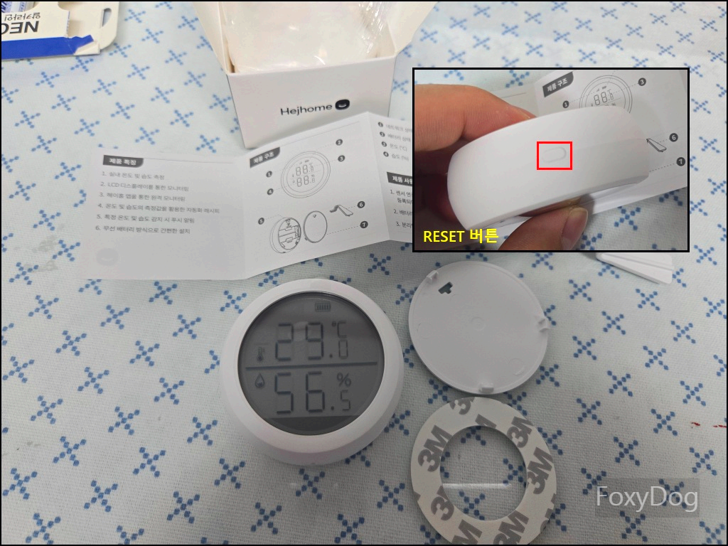 이번에 스마트 온습도계가 하나 더 추가되었습니다. 한 번 헤이홈을 구축해 놓으니 생각보다 다양하게 활용하게 되네요. 제품은 「지름 6.1cm, 무게 68g」으로 손에 쏙 들어오는 앙증맞은 크기입니다. 1.8인치 LCD 디스플레이는 숫자가 큼직하게 표시되어 시인성도 상당히 좋습니다. 다만 건전지는 별도 구매가 필요하므로, 필자는 다이소 AAA 건전지를 사용했습니다.