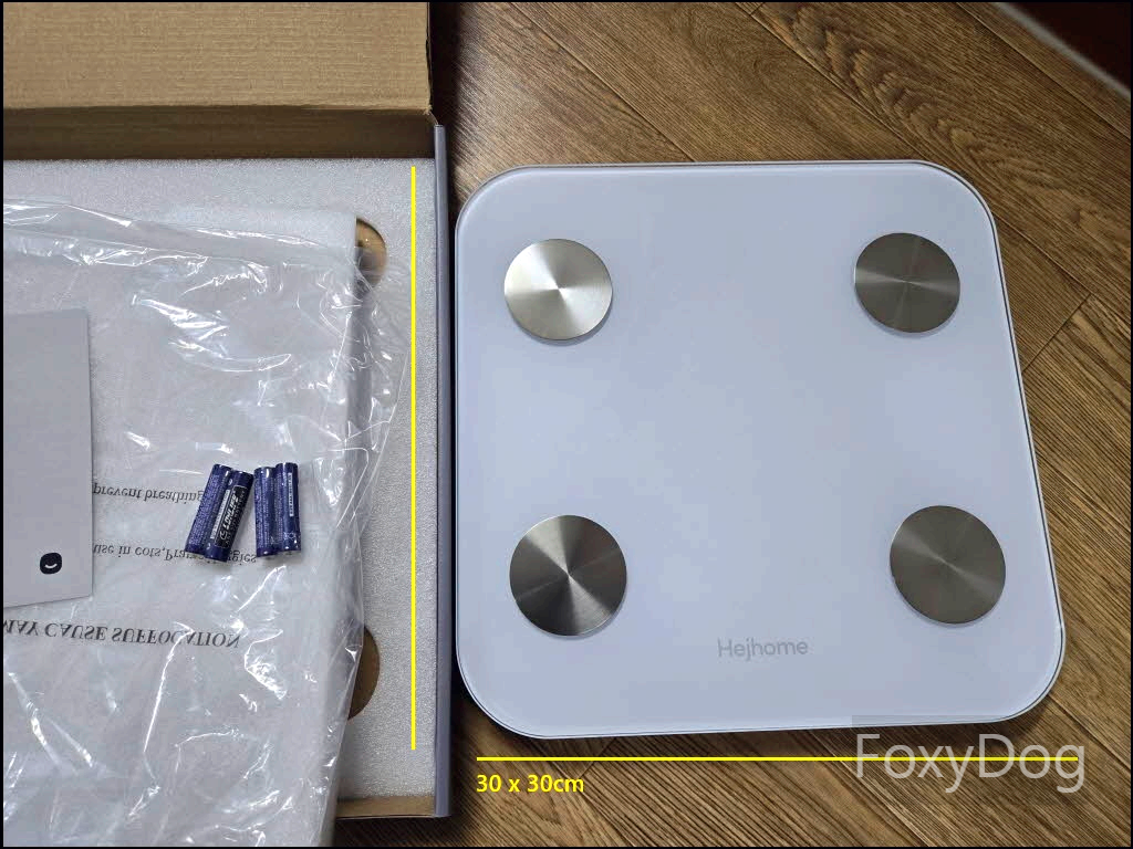이후로 스마트 체중계도 추가로 구입하였습니다. 제품은 무난한 크기의 정사각형 「30 x 30cm, 두께 24mm」 형태이며, 상단은 「6mm」 강화유리로 제작되어 웬만한 무게에도 견딜 수 있도록 설계되어 있습니다. 일반적인 사용 환경에서는 내구성과 안정성 모두 뛰어나다고 합니다.
