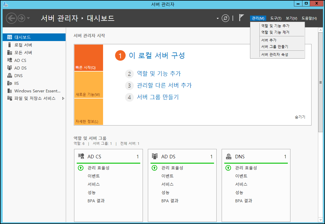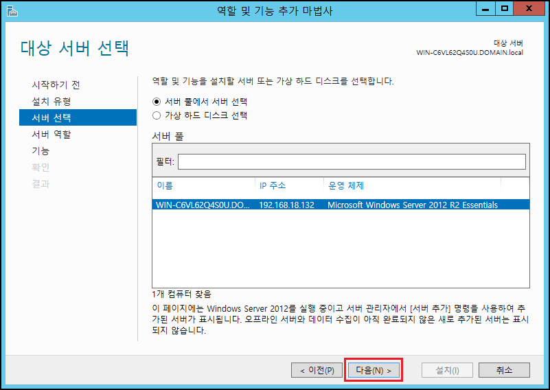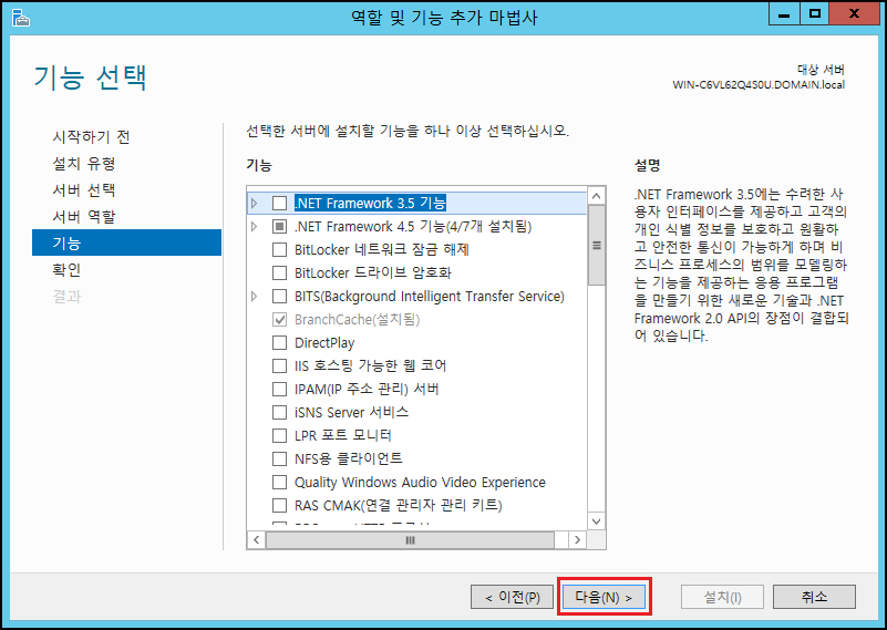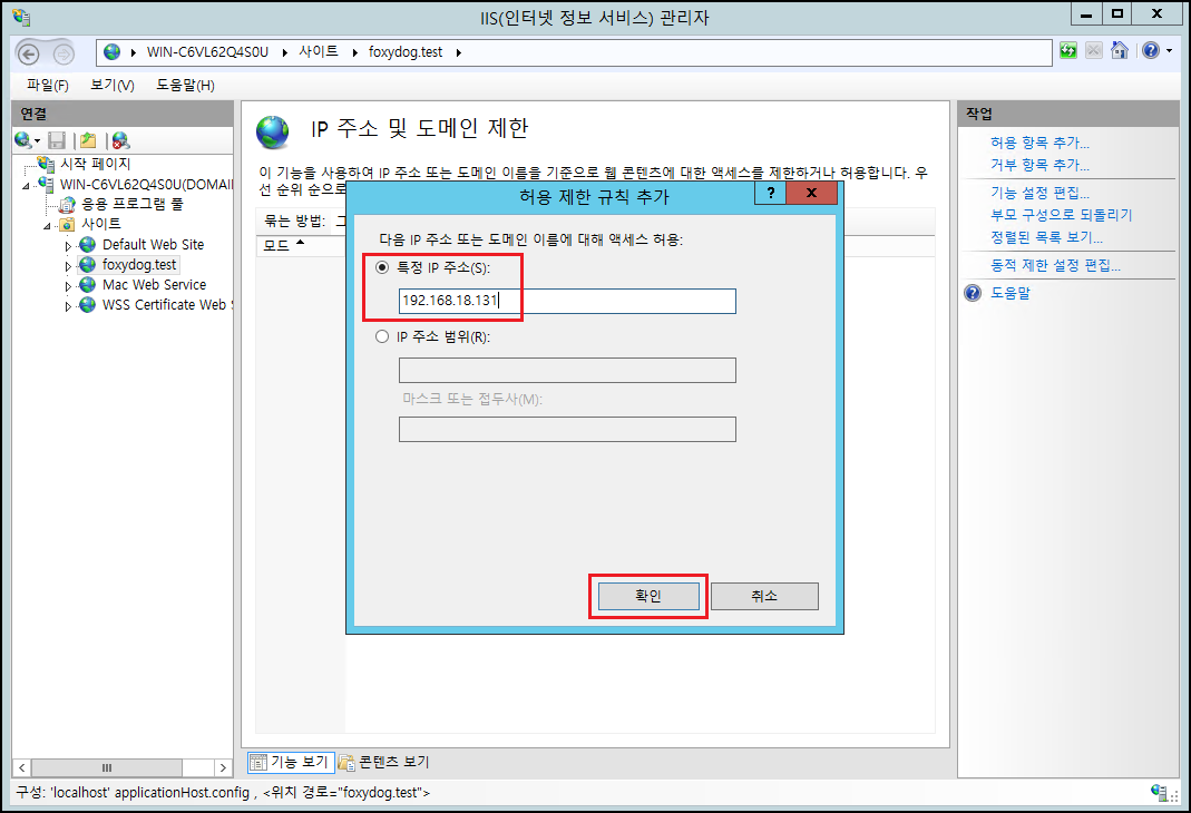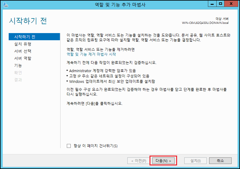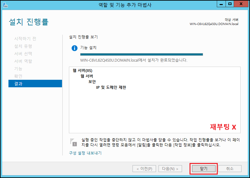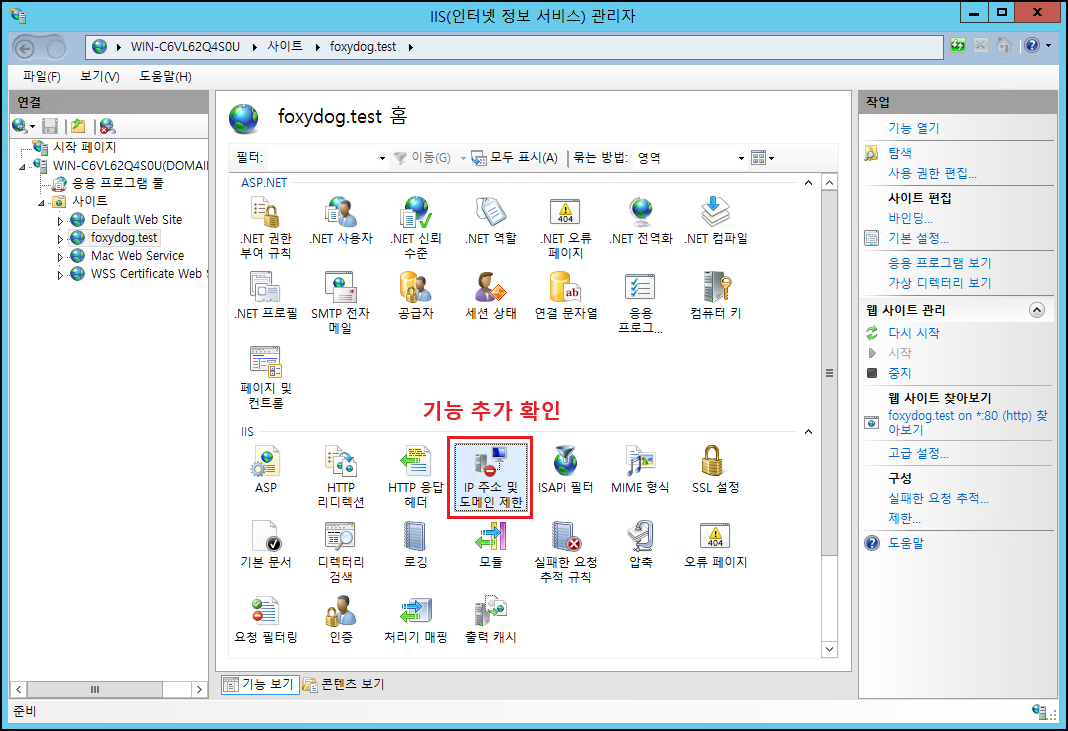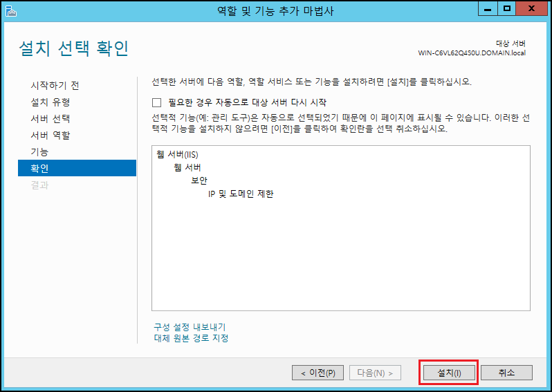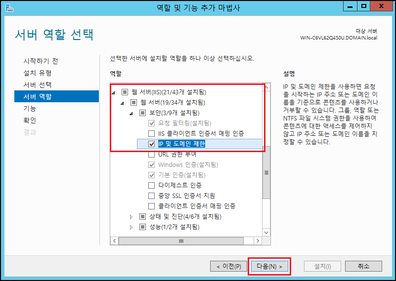 처음 IIS 설치 시 「IP 주소 및 도메인」 선택을 하지 않았다면 다시 서버 관리자에서 역할 및 기능 추가를 진행해 주시면 됩니다. 해당 기능은 서버 재시작은 하지 않습니다.