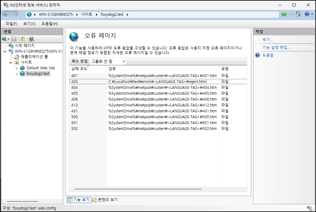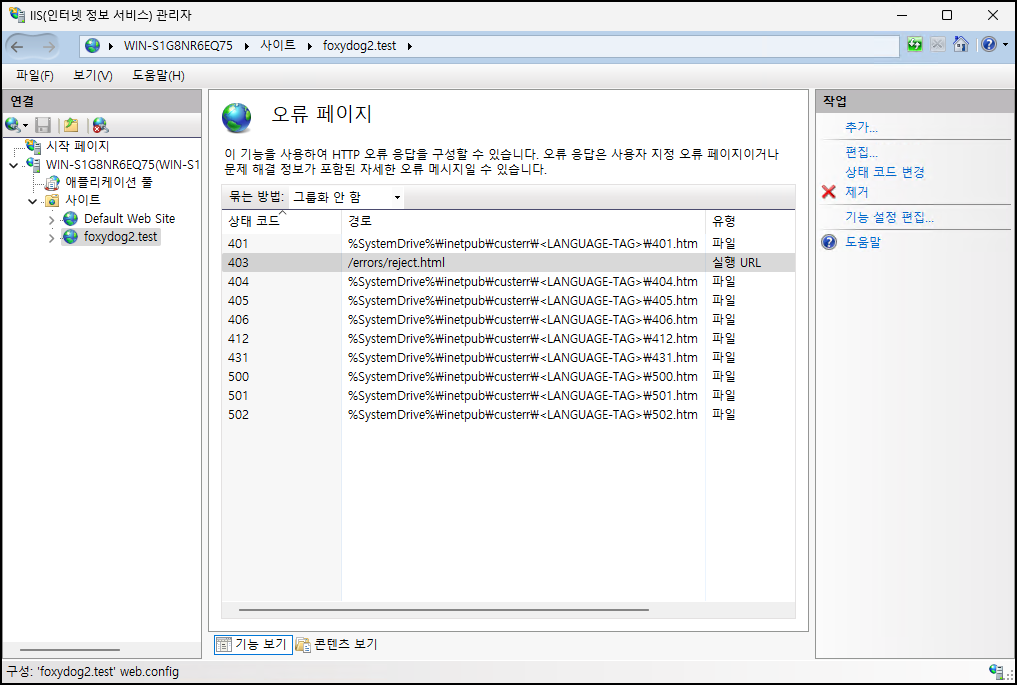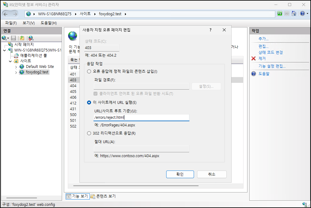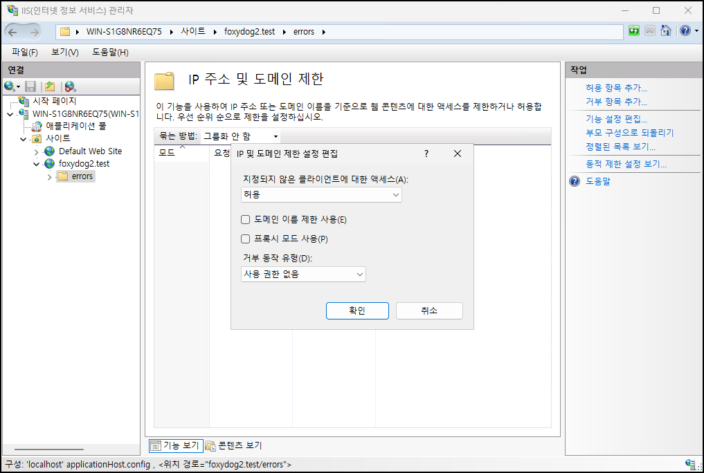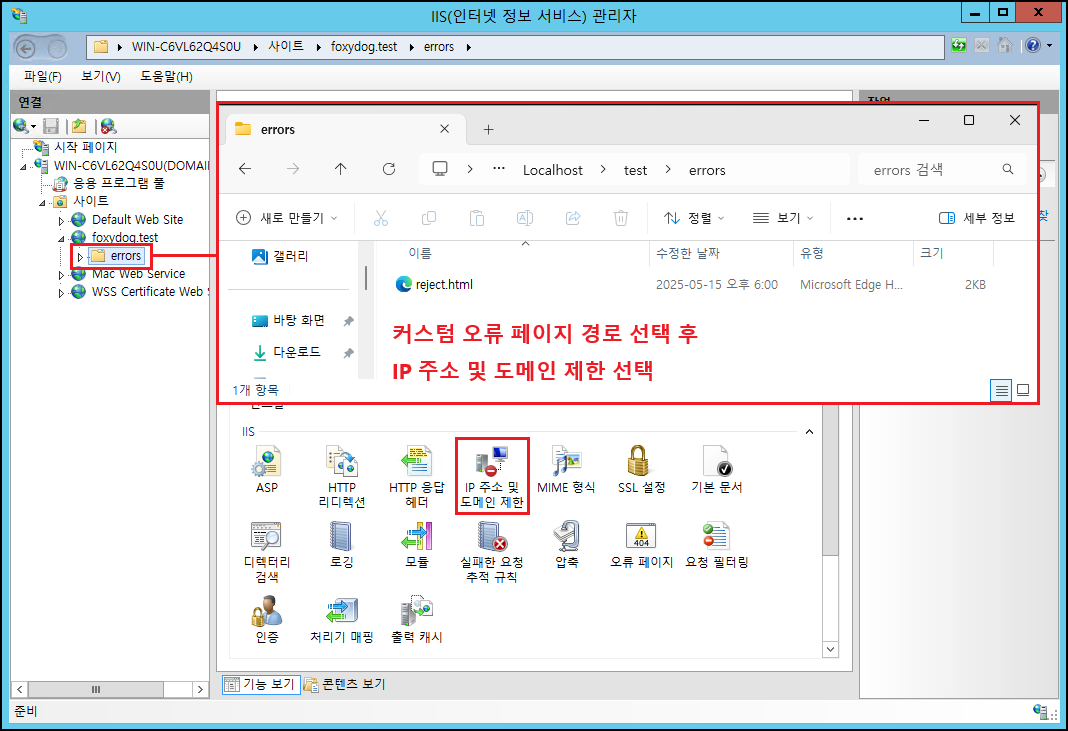 그럼 해결 방법은 무엇일까요? 의외로 간단했습니다. 오류 페이지로 지정된 경로만 별도로 예외 처리해 주면 됩니다. 예를 들어, /errors/reject.html 같은 경로로 오류 페이지를 설정했다면, IIS IP 및 도메인 제한 설정에서 해당 경로(URL 기준)를 예외로 추가하면 됩니다.