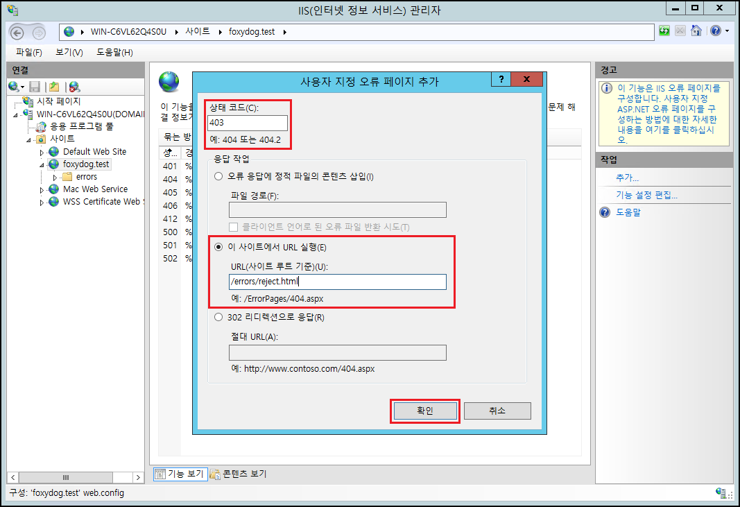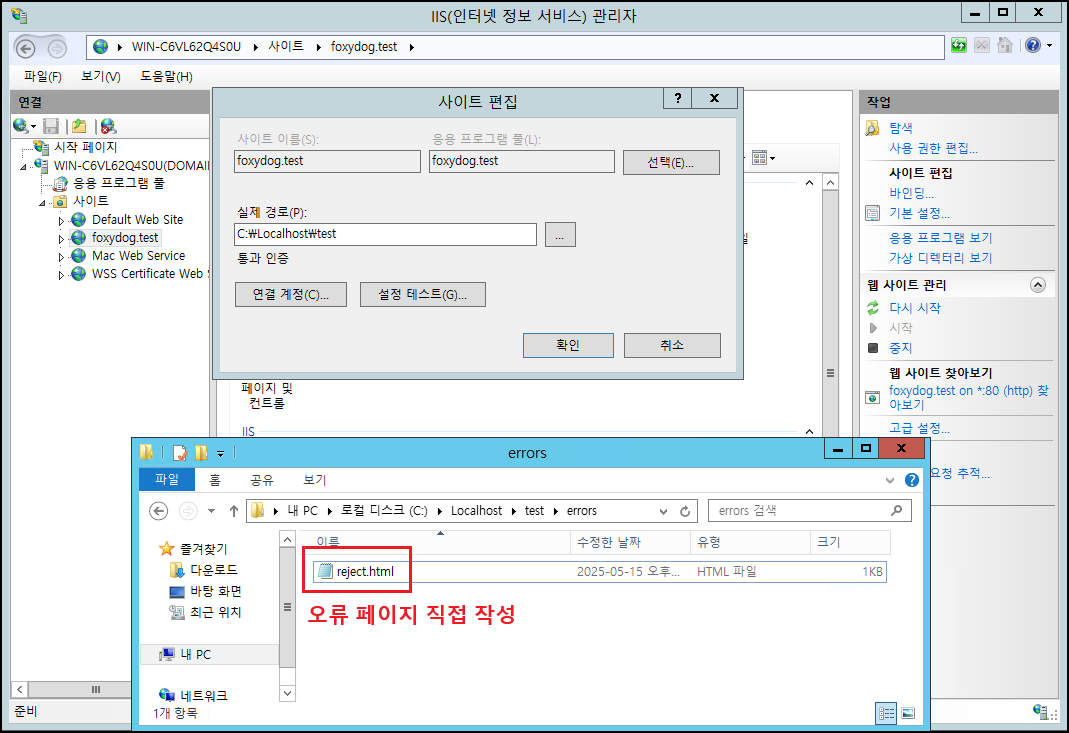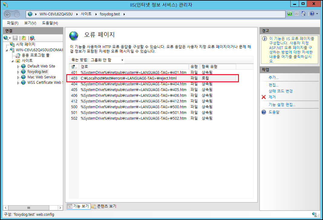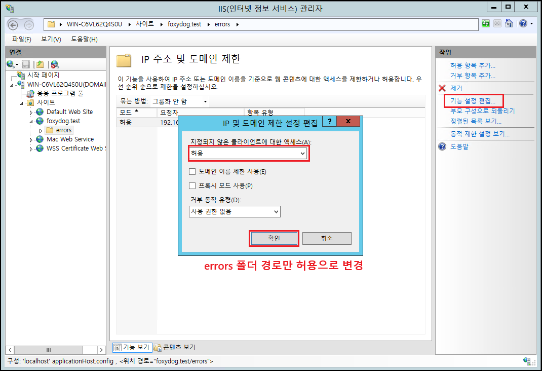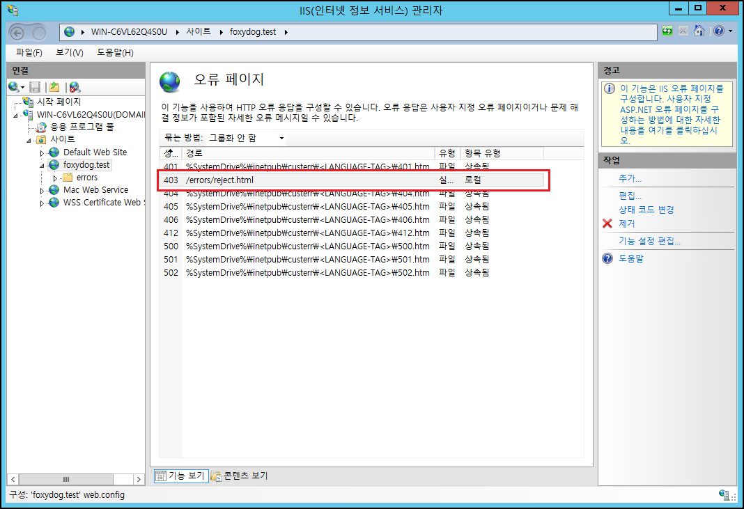 그럼 해결 방법은 무엇일까요? 의외로 간단했습니다. 오류 페이지로 지정된 경로만 별도로 예외 처리해 주면 됩니다. 예를 들어, /errors/reject.html 같은 경로로 오류 페이지를 설정했다면, IIS IP 및 도메인 제한 설정에서 해당 경로(URL 기준)를 예외로 추가하면 됩니다.