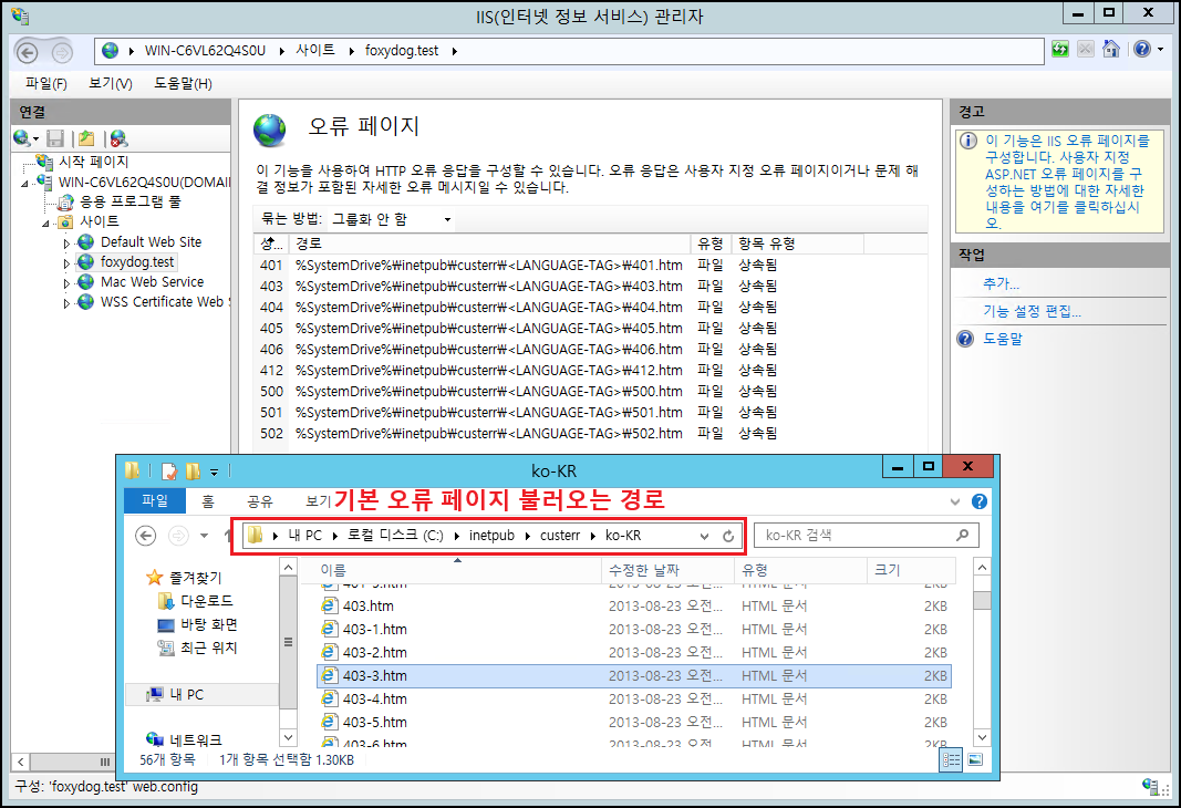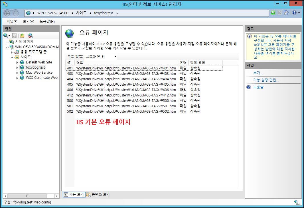 잘못된 접근에 의한 오류 페이지 설정을 할 수 있는 기능 합니다. 특정 페이지에 접근하거나, 제한된 운영을 할 경우 코드에 따라 오류 메시지를 다르게 할 수 있습니다. 내가 직접 .htm(html) / .ASP 소스를 작성하여 연결할 수도 있습니다.