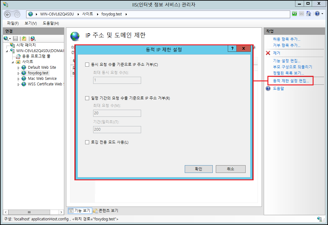 「동적 IP 제한 설정」 동시 요청(세션) 수를 기준 또는 일정 기간의 요청 수를 기준으로 IP 주소를 거부할 수도 있습니다.
