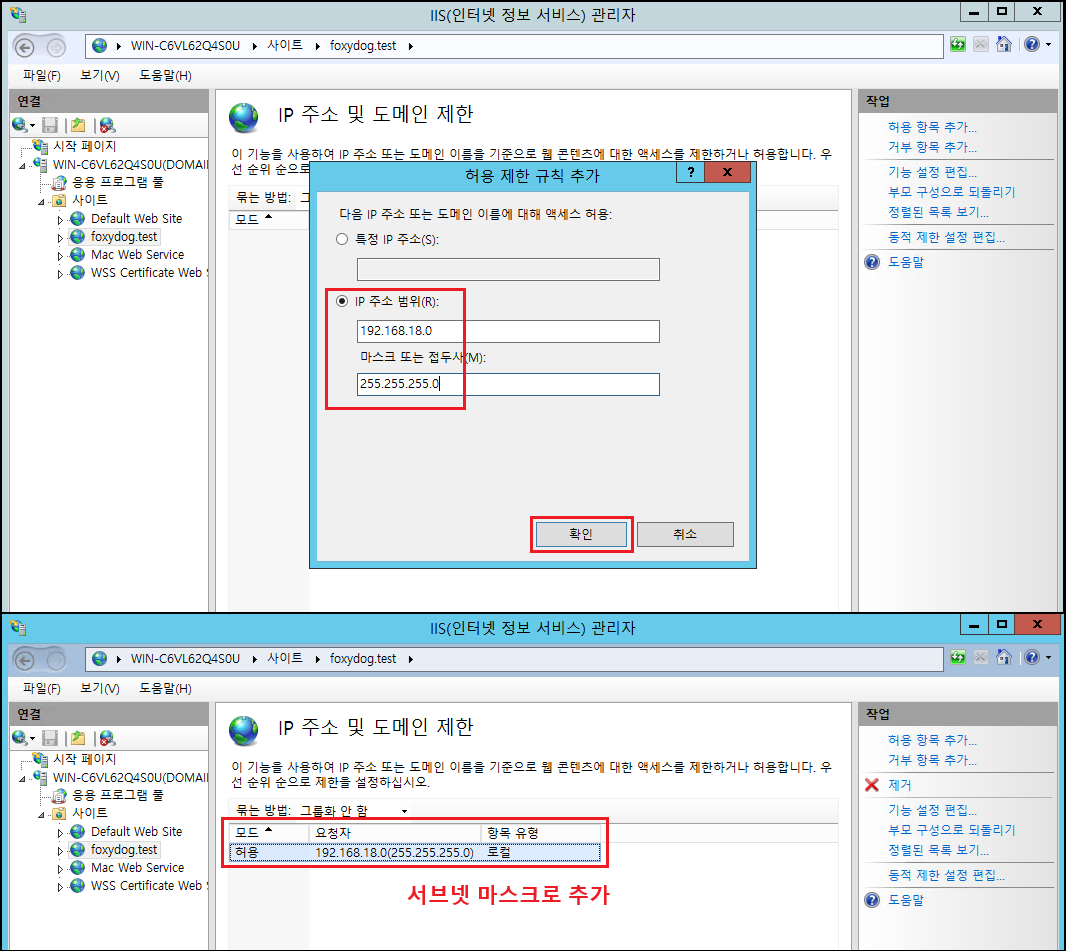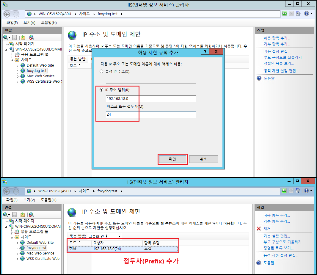 모든 접근을 차단한 후, 특정 클라이언트 IP만 접근할 수 있도록 「허용 항목 추가」를 합니다. 「특정 IP 주소」는 단일 IP에 대해 허용하고, 「IP 주소 범위」는 서브넷 마스크(예: 255.255.255.0) 또는 접두사(Prefix) 표기(/24) 방식으로 설정할 수 있습니다. 둘 다 같은 의미이며 예를 들어 192.168.18.0/24는 192.168.18.0부터 192.168.18.255까지의 IP를 허용하는 의미입니다. 네트워크 관련은 그냥 외우자
