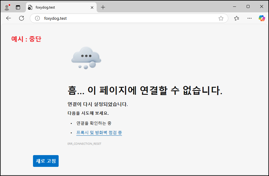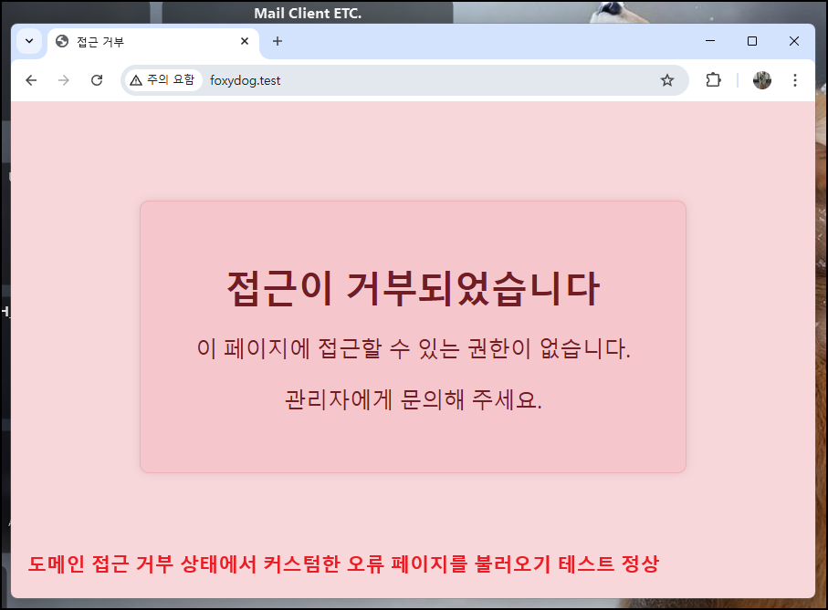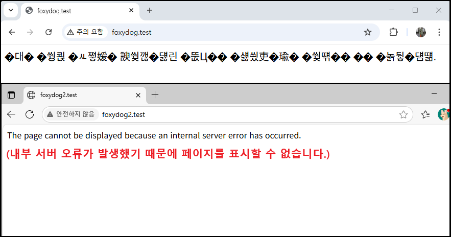 도메인 접근을 기본적으로 「거부(Deny)」로 설정하고, 특정 허용된 IP만 예외로 두었으며, 나머지 외부 접근 자에겐 커스텀 에러 페이지를 보여주도록 설정했습니다. 그런데 실제로 테스트해 보니 다음과 같은 에러가 발생합니다. 「 The page cannot be displayed because an internal server error has occurred.」