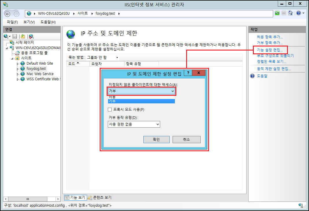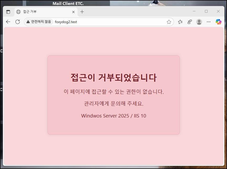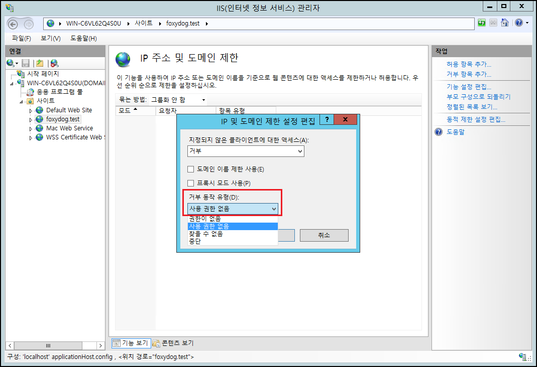 오류 페이지 역시 결국 HTTP(S)를 통해 불러와지는 리소스입니다. 그런데 도메인 접근 자체를 막아버리면, 오류 페이지의 경로조차도 접근이 제한되어 「IIS 내부적으로 500 오류」가 발생하게 되는 구조입니다.