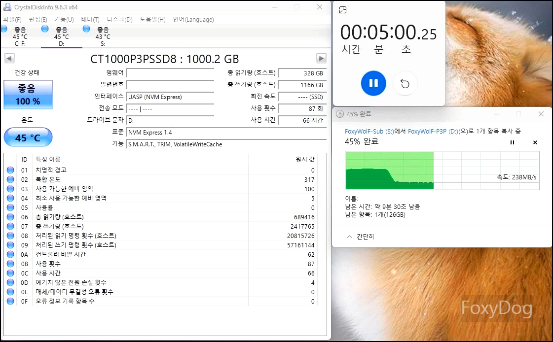 ③ 5분 정도 경과 : 45℃ 안정적으로 전송 중. 확실히 연속 읽기 쓰기에서는 쿨링 팬의 효과가 매우 큽니다. 이전 제품에서는 온도가 60℃ 까지 올라가기 시작하면서 스로틀링에 의해 「약 100MB/s = 1 Gbps」으로 속도가 제한되며 회복하지를 못하는데, 온도가 안정적이라서 그런지 「약 250MB/s = 2.5 Gbps」 속도로 계속 유지를 하고 있습니다.
