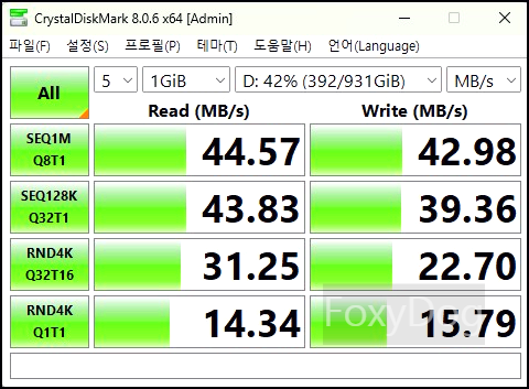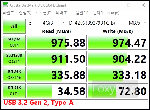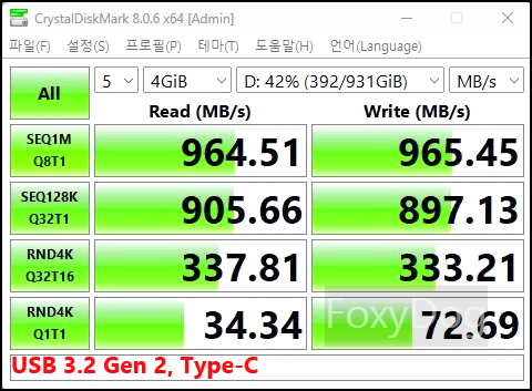 아... 생각해 보니 집 PC 메인보드도 USB-C/USB-A 3.2 Gen2 (10 Gbps)까지만 지원해서, 결국 최대 전송 속도는 약 「1000MB/s」 정도밖에 확인할 수 없습니다. 그래서 연속 쓰기 성능과 온도 유지 여부만 테스트를 해봐야 할 것 같습니다.