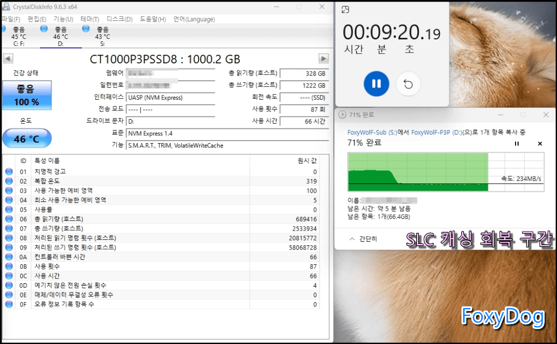 ④ 약 9분 정도 경과 : 46℃ 유지. 오히려, SLC 캐싱이 확보되면서 다시 원래(약 700MB/s 유지)의 속도로 회복을 하는 모습이 보입니다. 이 상태로 마지막까지 11분 만에 230GB 파일이 복사 또는 이동이 되었습니다. 이때의 온도는 약 52℃ 정도로 마무리되었습니다.