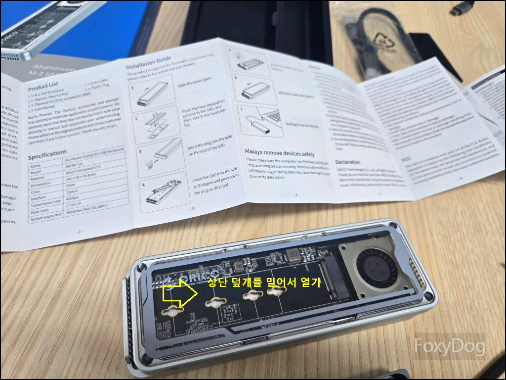 메인 제품인 외장 SSD 케이스 인클로저(Enclosure)입니다. 정식 모델명은 「ORICO-AAGM2-U4」이며, U4는 「USB4」 규격을 의미합니다. 이 제품은 썬더볼트(Thunderbolt)와 동일한 USB-C 타입 단자를 사용하지만, 내부 규격과 기능은 다릅니다.