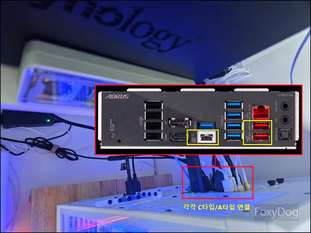 이렇게 메인보드에 표시된 「USB 3.2 Gen 2 10 Gbps, Type-C」, 「USB 3.2 Gen2 10 Gbps, Type-A」 타입으로 되어 있으면 최대 「약 1000MB/s」 전송 속도가 나옵니다. 외장 케이스의 성능이 제대로 나오고 있다고 판단이 됩니다. 만약 숫자가 20으로 되어 있다면 「20 Gbps(2.5GB/s)」으로 생각하면 편합니다.