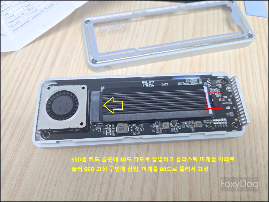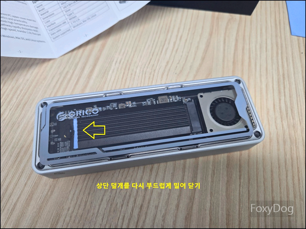 SSD 고정은 나사가 아닌 플라스틱 마개(버클)를 사용하여 손으로 손쉽게 조립할 수 있도록 되어 있습니다. 필자는 보유 중인 Crucial P3 PLUS M.2 NVMe (2280 폼팩터)에 맞춰 설치를 진행했습니다. 다만 한 가지 아쉬운 점은, 상단 덮개가 생각보다 너무 쉽게 분리된다는 점입니다. 고정력이 약해 높은 곳에서 제품이 떨어질 경우 내부 SSD 보호에 취약할 수 있으니 주의가 필요합니다.