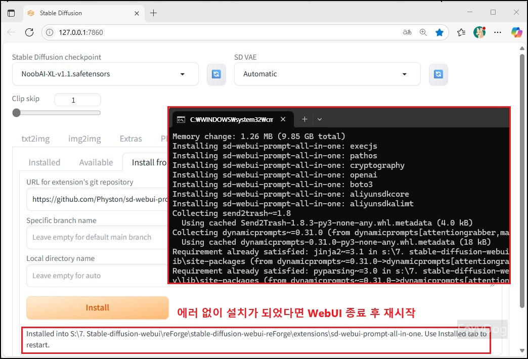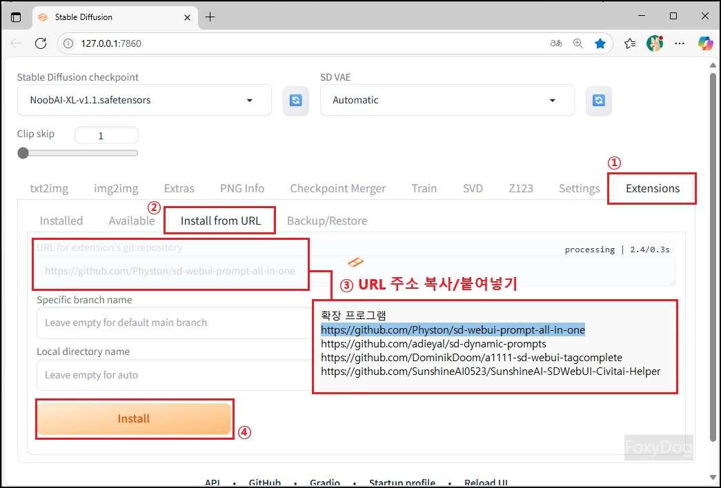 ※ WebUI → Extensions → Install from URL 탭으로 이동 후 URL 복사/붙여 넣기 Install로 간단 설치 가능