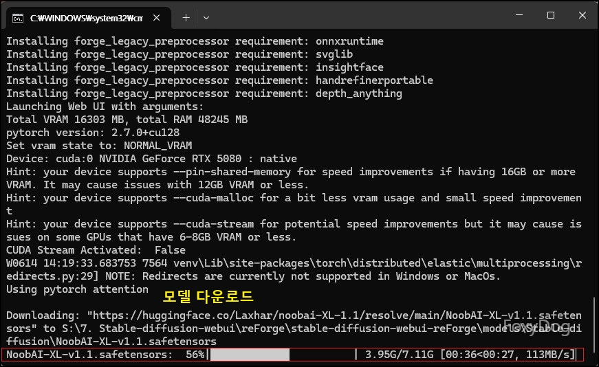 ※ 처음에는 위 버전으로 설치를 했지만, NVIDIA GeForce RTX 5080 with CUDA capability sm_120 is not compatible with the current PyTorch installation. 「번역 : CUDA 기능이 있는 NVIDIA GeForce RTX 5080 sm_120은 현재 파이토치(PyTorch) 설치와 호환되지 않습니다.」 에러가 발생하여 보류, 이후 방법을 찾게 되면 추가 포스팅 예정