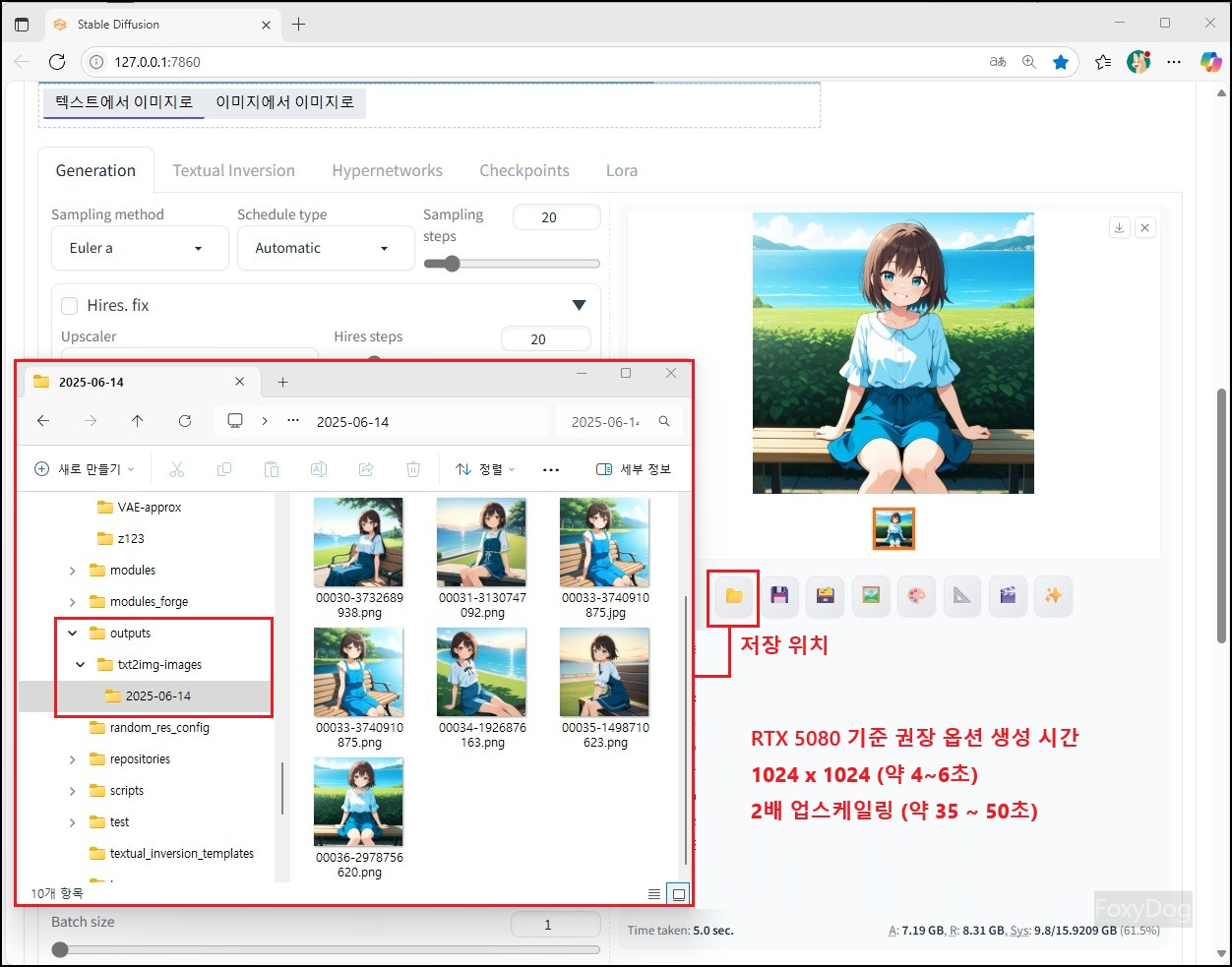 단일 1024 x 1024 이미지 생성은 생각보다 빠르게 완료됩니다. 다만, 쿠다(CUDA) 수가 적은 만큼 약 6~7배 정도 느리게 느껴지긴 합니다. AI 성능은 업스케일링이나 다중 작업에서 큰 차이를 보이는 듯합니다. 같은 세대 스펙이라도 RTX 5000번대의 AI 연산 성능이 훨씬 우수한 것으로 보입니다.