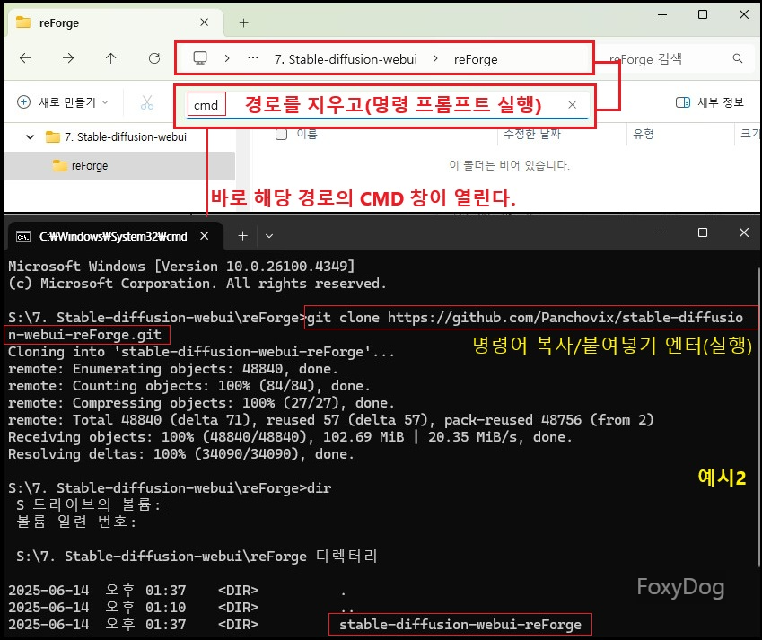 ※③ > git clone https://github.com/Panchovix/stable-diffusion-webui-reForge.git 「명령어 복사/붙여 넣기 후 실행 / 용량은 약 136MB 정도」