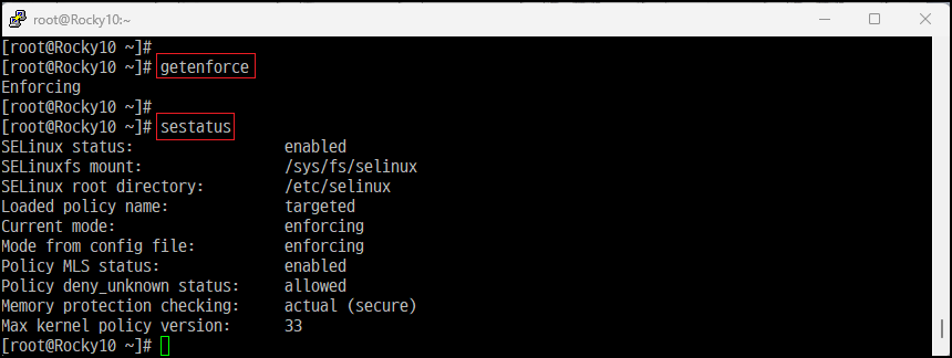 [root@]# sestatus [SELinux 전체 상태 확인]