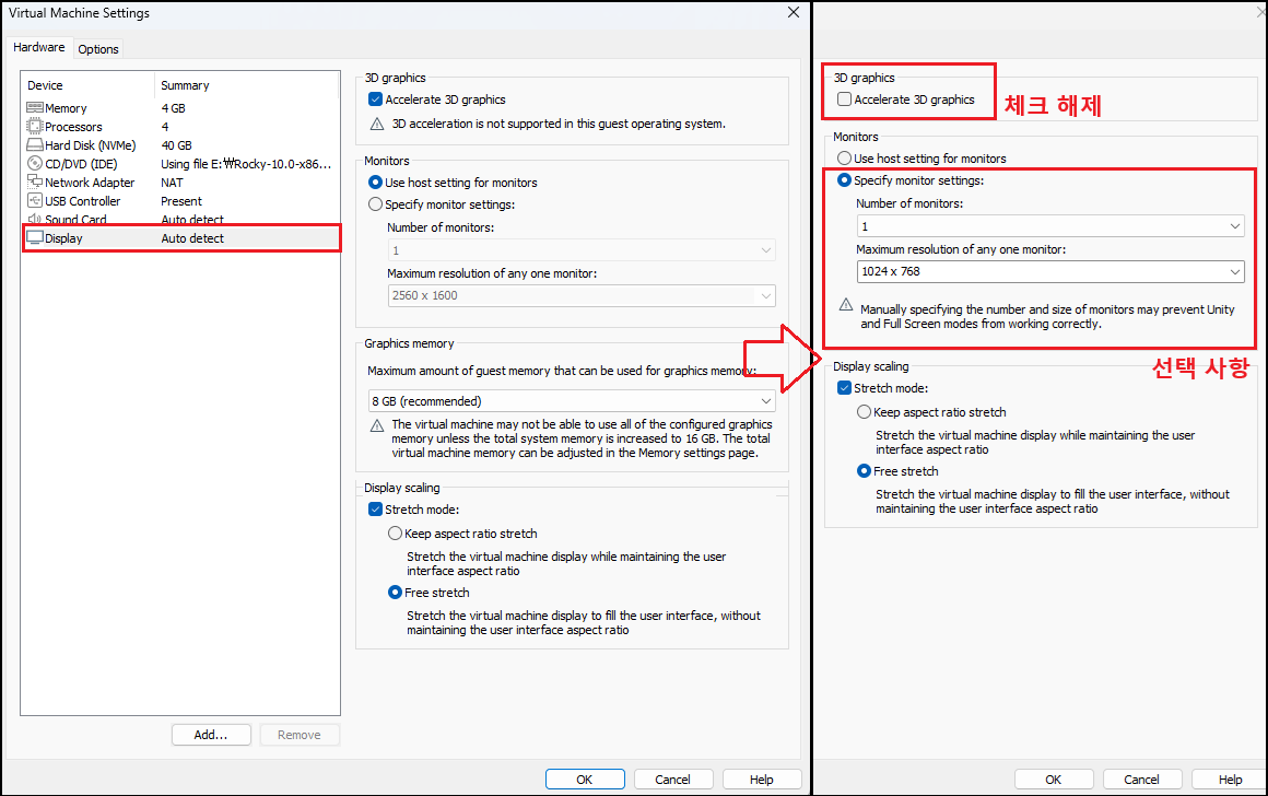 VMware 최신 버전으로 업데이트한 이후, 가상 머신 생성 시 기본적으로 Acceleate 3D graphics [3D 그래픽 가속화] 기능이 활성화되어 있는 것을 확인할 수 있습니다. 이 기능이 체크된 상태라도 PC 클라이언트 환경에 따라 문제없이 작동할 수는 있지만, 2대 이상의 PC에서 테스트한 결과, 리눅스 서버는 해당 옵션을 비활성화하는 것이 좋습니다.