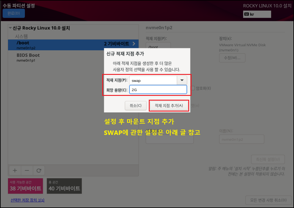 ◇ SWAP은 일종의 메모리 확보라고 생각하시면 될듯합니다. 하드디스크의 일부를 마치 메모리처럼 사용할 수 있게 해주는 기술입니다. RAM 메모리가 부족할 때 대신 SWAP 파티션을 잡아두었던 메모리를 사용합니다. 일반적으로 RAM 사용량의 2배 이상 권고 설정이라고 알고 있는 분들도 있으시겠지만 서버의 용도나 실서버 하드웨어에 들어가는 RAM 용량이 얼마냐에 따라 튜닝 작업을 해야 합니다. 하지만 저희는 테스트이며 기본적으로 1~2GB RAM으로 세팅하므로 위 동일하게 하시고 넘어가면 됩니다. 하드디스크의 용량을 사용하기 때문에 충분히 용량을 확인하고 설정하시기 바랍니다.