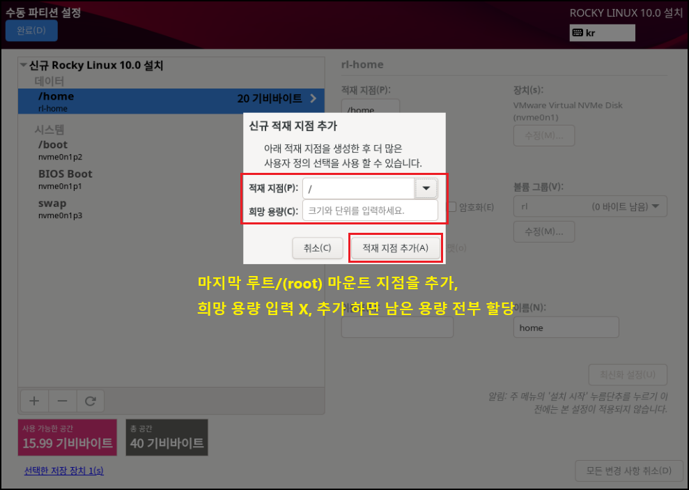 ◇ 파일 시스템[EXT4], 장치 유형[LVM]으로 설정하는 이유는 속도나 효율적으로 디스크를 사용 및 관리하기 위해서입니다. 이제 가상화 솔루션에서도 많이 안정화되었으며 여러모로 특징이 많으므로 기본적으로 사용하는 게 좋습니다. 수동으로 설정하는 이유도, 개발 및 시스템 관리자가 될 경우 OS를 설치할 때 소프트웨어를 편하게 관리하기 위해 파티션 별로 용량을 나누고 볼륨 그룹, 레이블, 이름 등으로 구분할 수 있게 하는 연습을 하는 게 좋습니다.